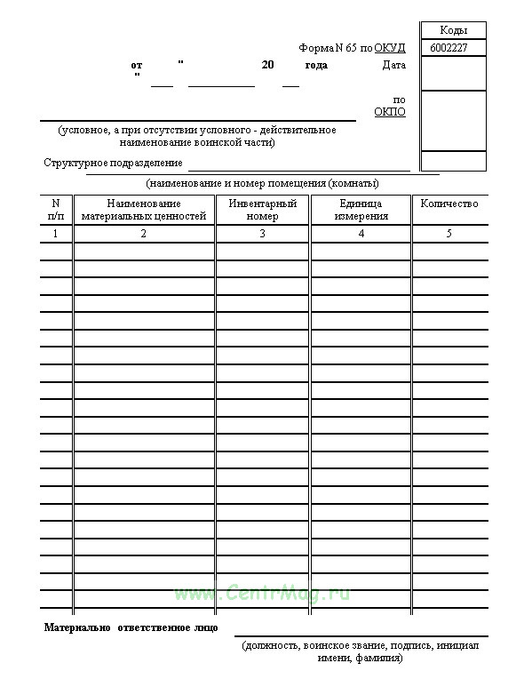 Форма Описи материальных ценностей, № 65, ОКУД 602227 входит в список Форм документов, используемых в финансово-хозяйственной деятельности Вооруженных Сил Российской Федерации согласно Приказу от 28 марта 2008 г. N 139.