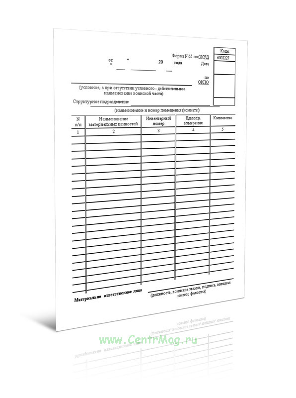 Опись материальных ценностей, Форма 65, ОКУД 602227