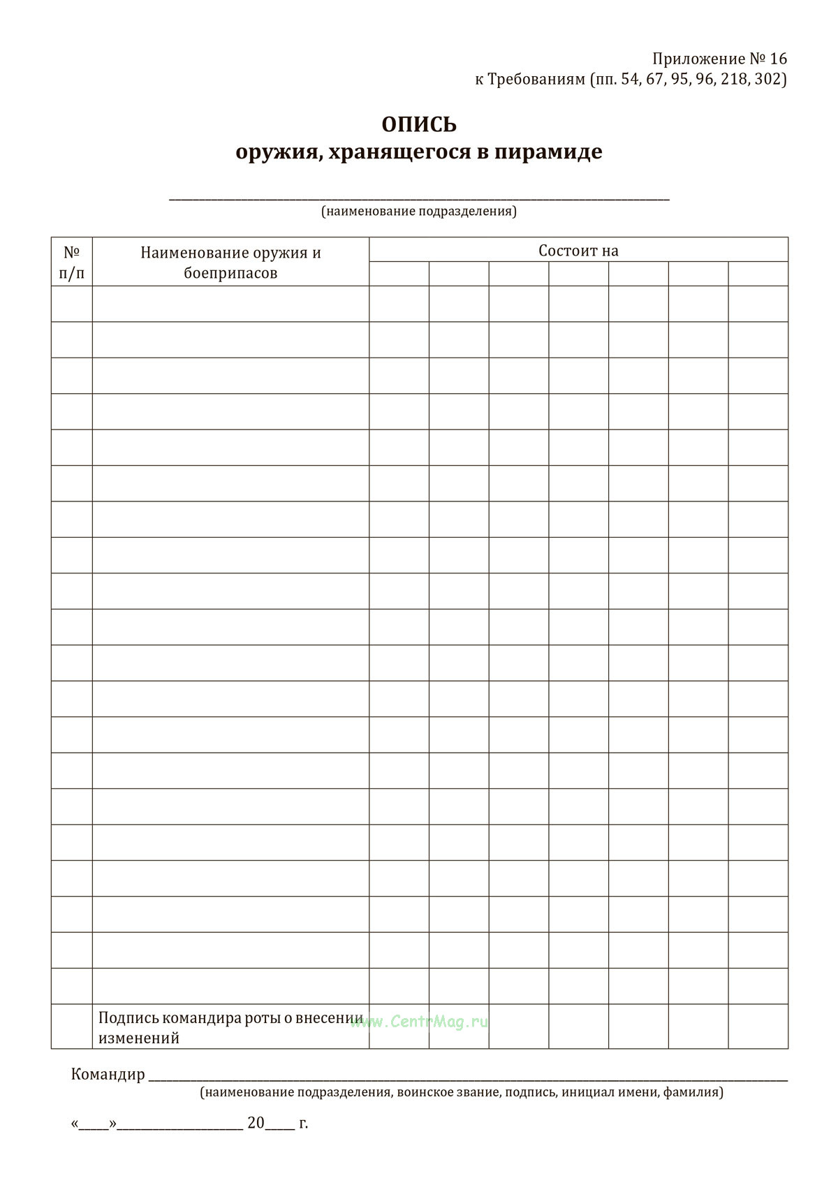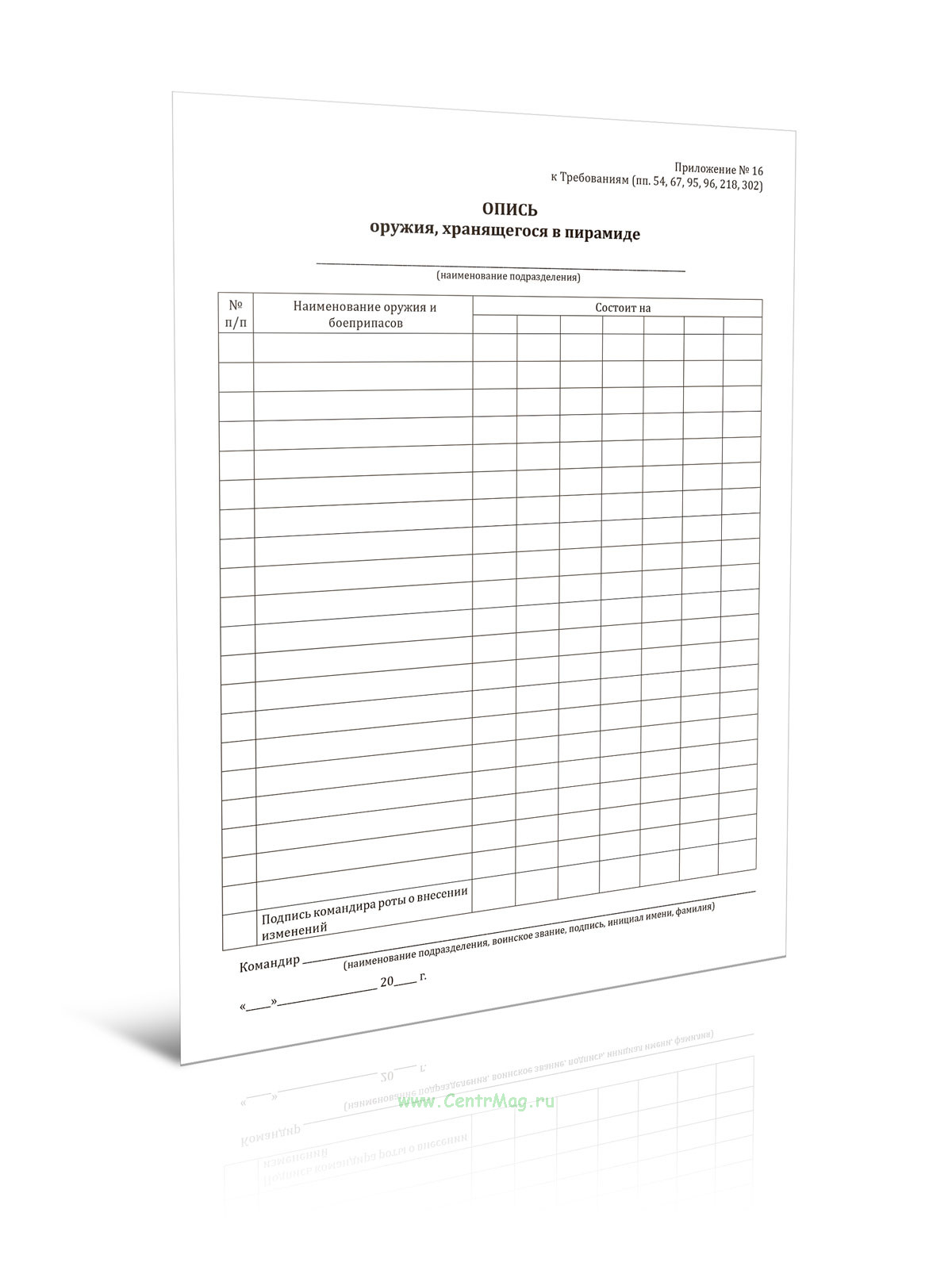 Форма Описи оружия, хранящегося в пирамиде соответствует Приложению 16 к Приказу Министра обороны РФ от 8 июля 2020 г. N 299.