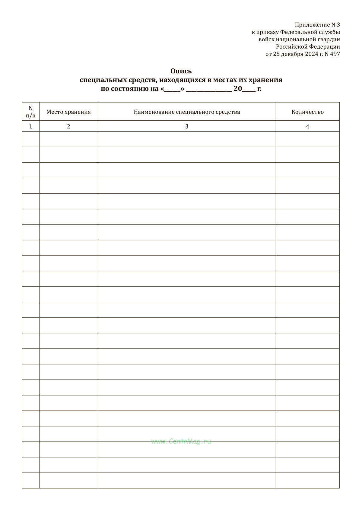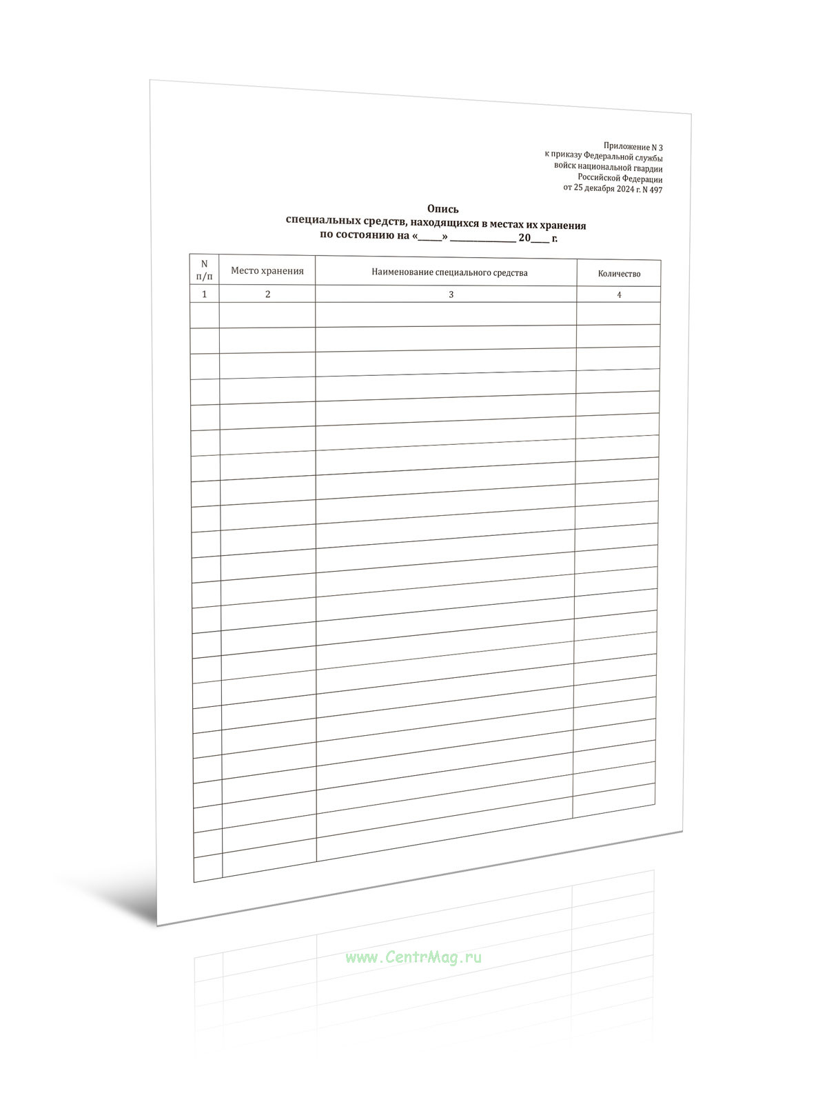 Форма Описи специальных средств, находящихся в местах их хранения соответствует Приложению № 3 к Приказу Росгвардии от 25.12.2024 N 497 "Об утверждении перечней, форм и порядков ведения документов, оформляемых ведомственной охраной федеральных государственных органов, федеральных органов исполнительной власти, высшего исполнительного органа субъекта Российской Федерации - города федерального значения Москвы, организаций, имеющих в соответствии с законодательством Российской Федерации право на создание ведомственной охраны, при приобретении, учете, передаче (возврате) специальных средств, а также публичным акционерным обществом "Сбербанк России" при передаче специальных средств"