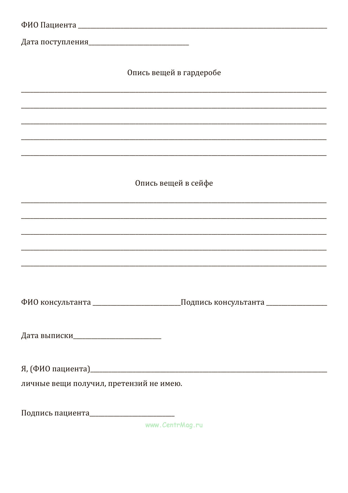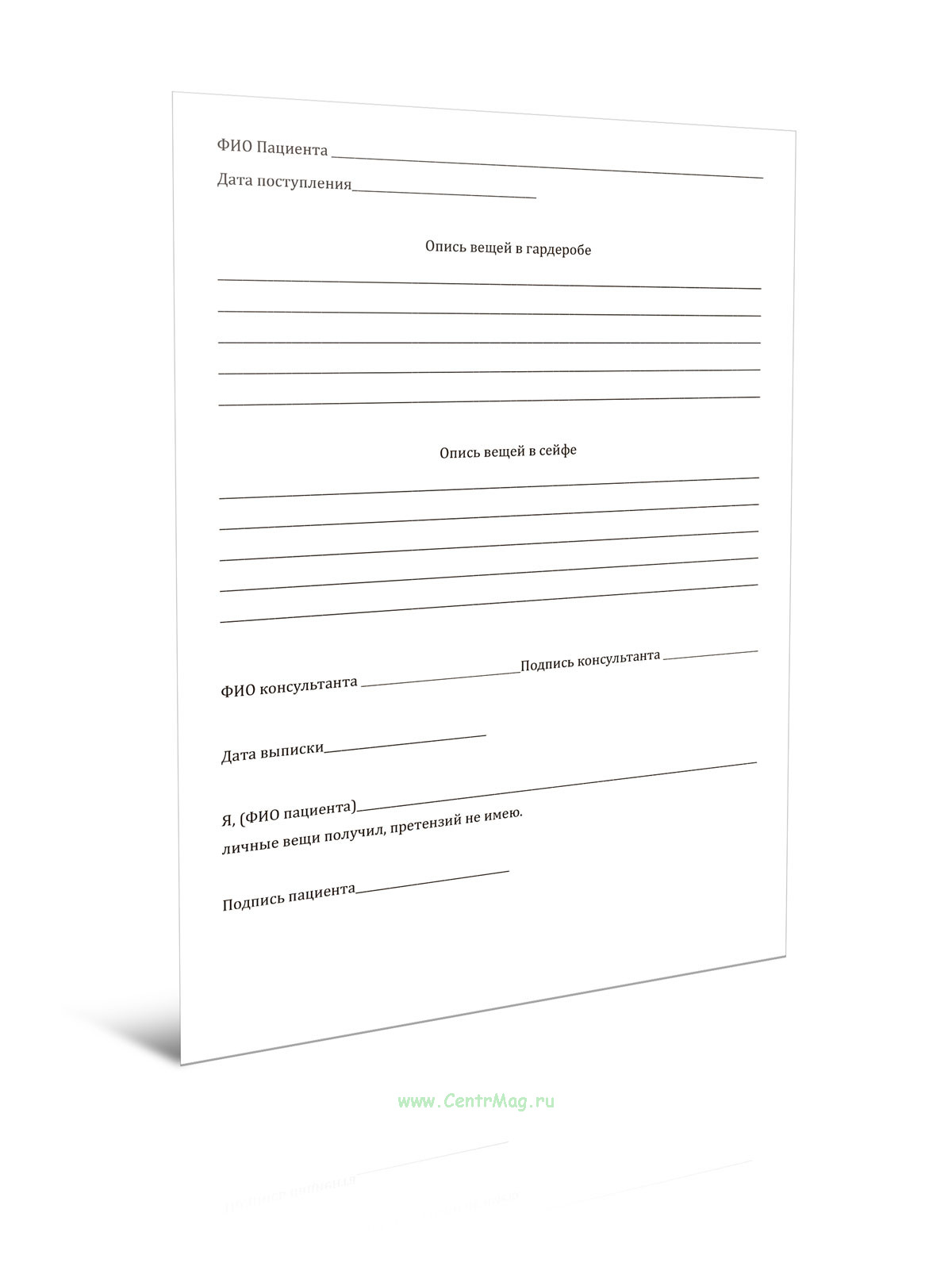 Бланк предназначенный для фиксации и хранения сведений о личных вещах, переданных пациентом при поступлении в медицинское учреждение. Он оформляется с разделением имущества на сданное в гардероб и помещённое в сейф, и заверяется подписями пациента и консультанта. Используется для обеспечения сохранности имущества и подтверждения его возврата при выписке.