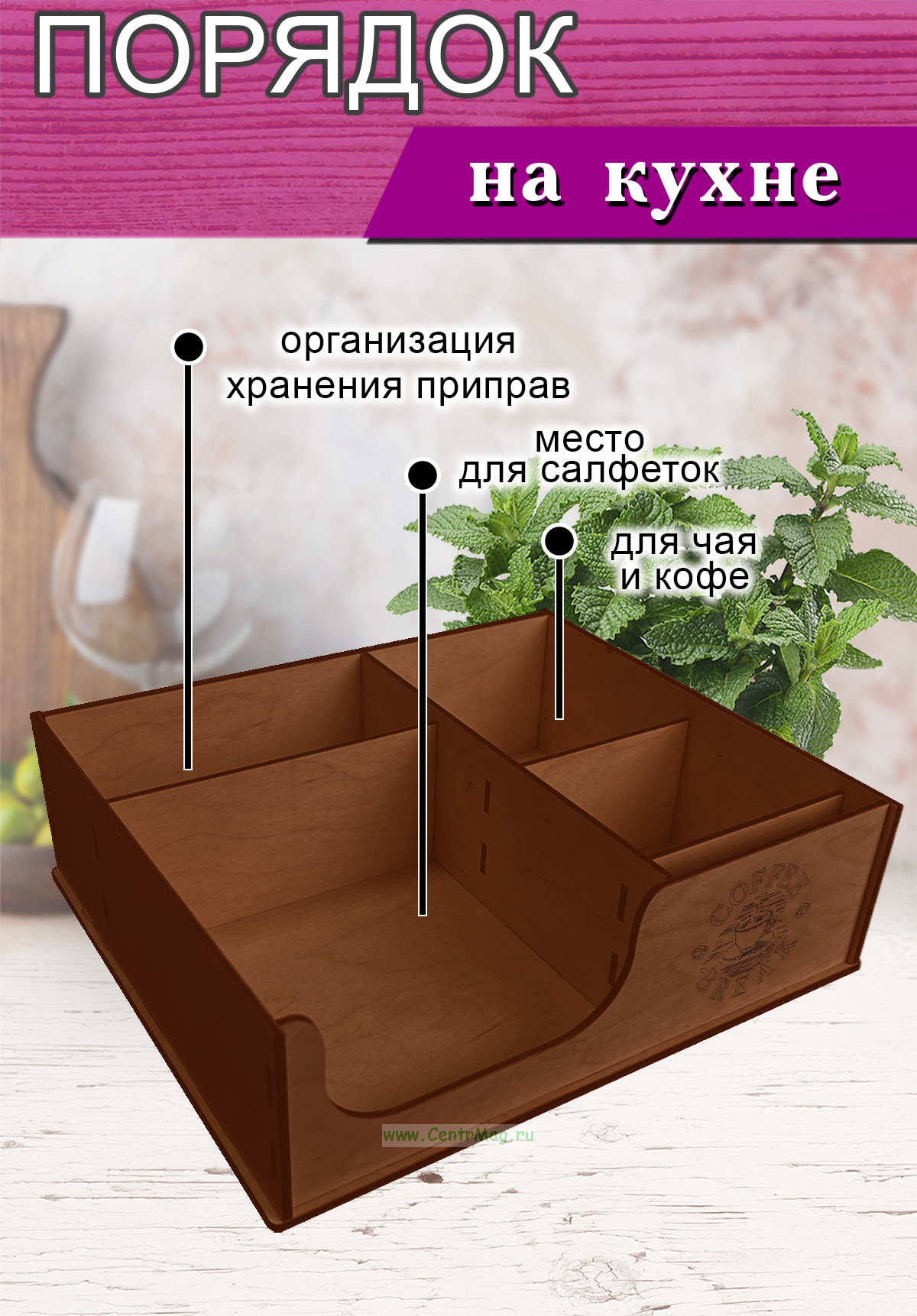 Дизайнерский органайзер для специй поможет организовать хранение приправ и салфеток, а также обеспечить порядок на кухне. Контейнер позволяет хранить салфетки или баночки с ароматным маслом, солью и перцем. В маленький отсек можно поставить ароматное масло для салатов, солонки и перечницы. Приятный натуральный дизайн контейнера дополнит любой интерьер и придаст ему домашний уют. Оптимальный размер позволяет расположить органайзер, как на столе, так и на полке шкафа.