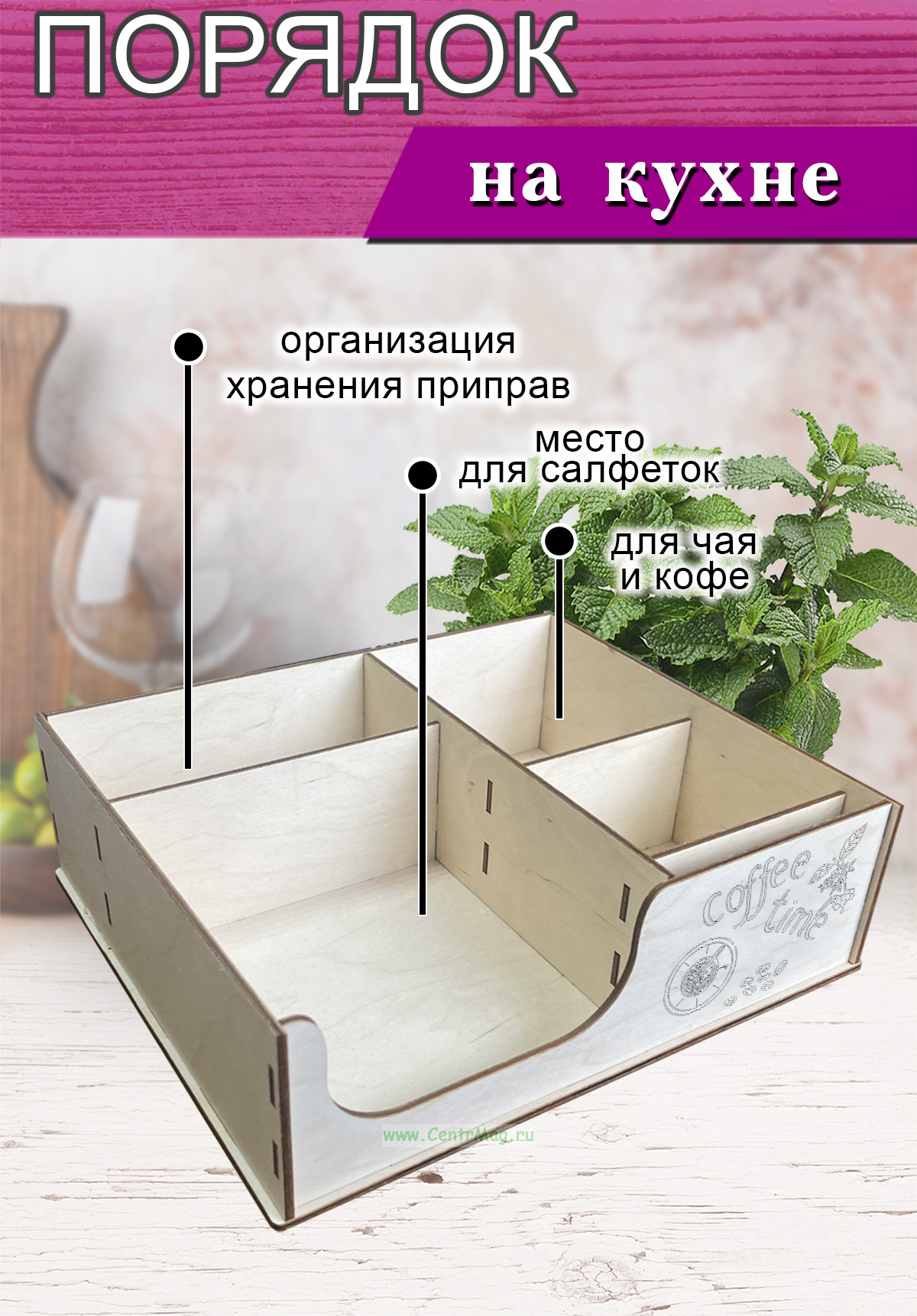 Органайзер барный для кофе, чая, специй и салфеток "Кофебиение" (мини, натуральный), 5 отсеков (370 руб.)