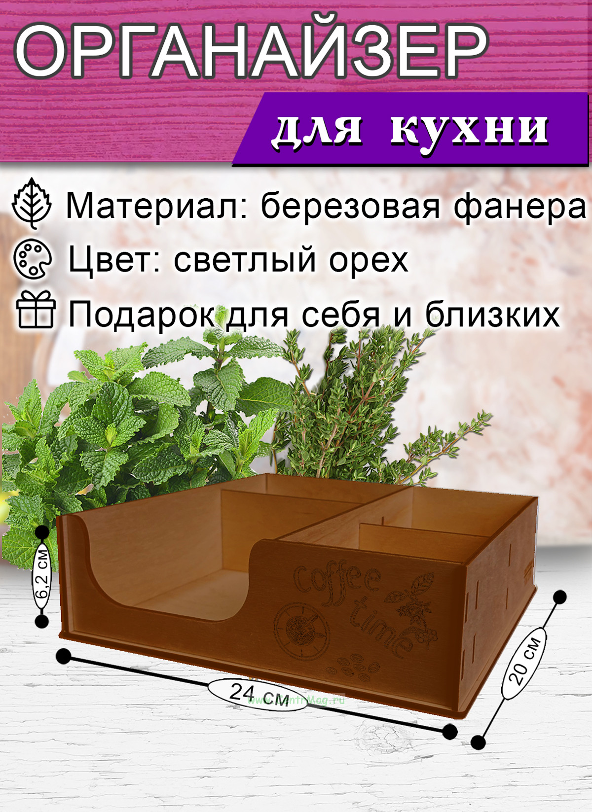 Дизайнерский органайзер для специй поможет организовать хранение приправ и салфеток, а также обеспечить порядок на кухне. Контейнер позволяет хранить салфетки или баночки с ароматным маслом, солью и перцем. В маленький отсек можно поставить ароматное масло для салатов, солонки и перечницы. Приятный натуральный дизайн контейнера дополнит любой интерьер и придаст ему домашний уют. Оптимальный размер позволяет расположить органайзер, как на столе, так и на полке шкафа.