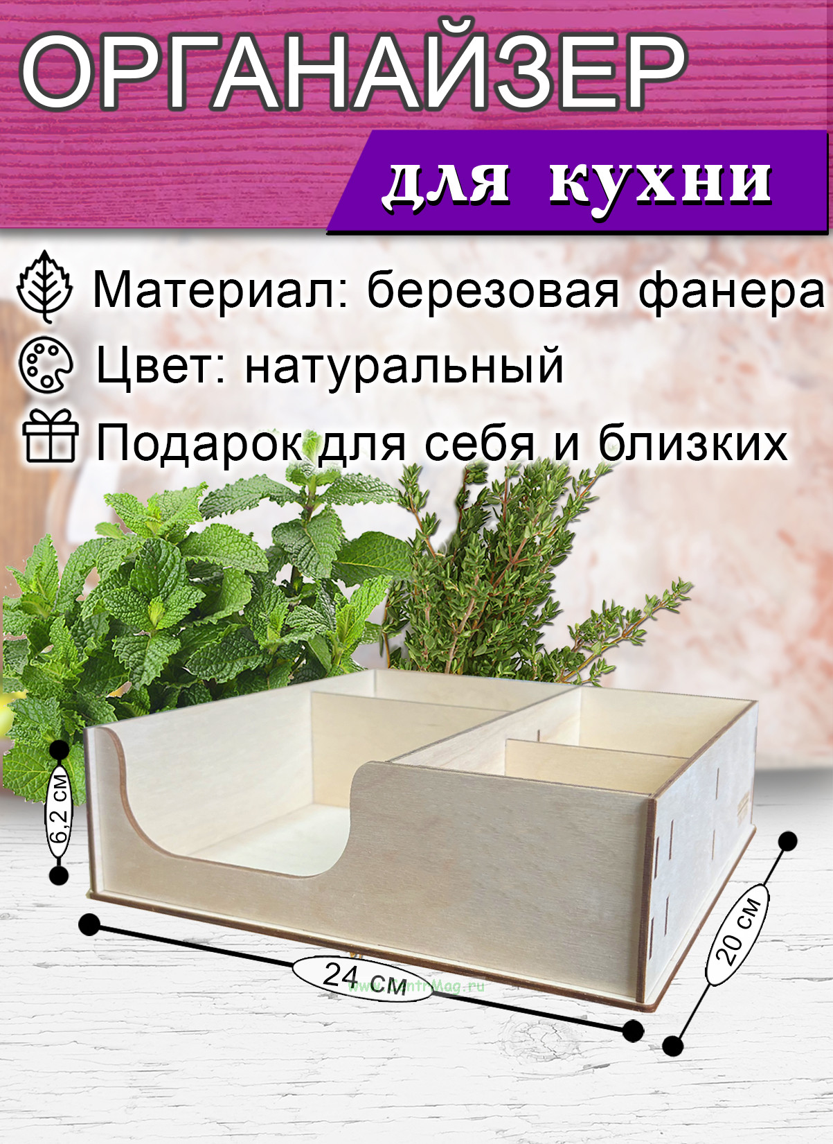 Дизайнерский органайзер для специй поможет организовать хранение приправ и салфеток, а также обеспечить порядок на кухне. Контейнер позволяет хранить салфетки или баночки с ароматным маслом, солью и перцем. В маленький отсек можно поставить ароматное масло для салатов, солонки и перечницы. Приятный натуральный дизайн контейнера дополнит любой интерьер и придаст ему домашний уют. Оптимальный размер позволяет расположить органайзер, как на столе, так и на полке шкафа.