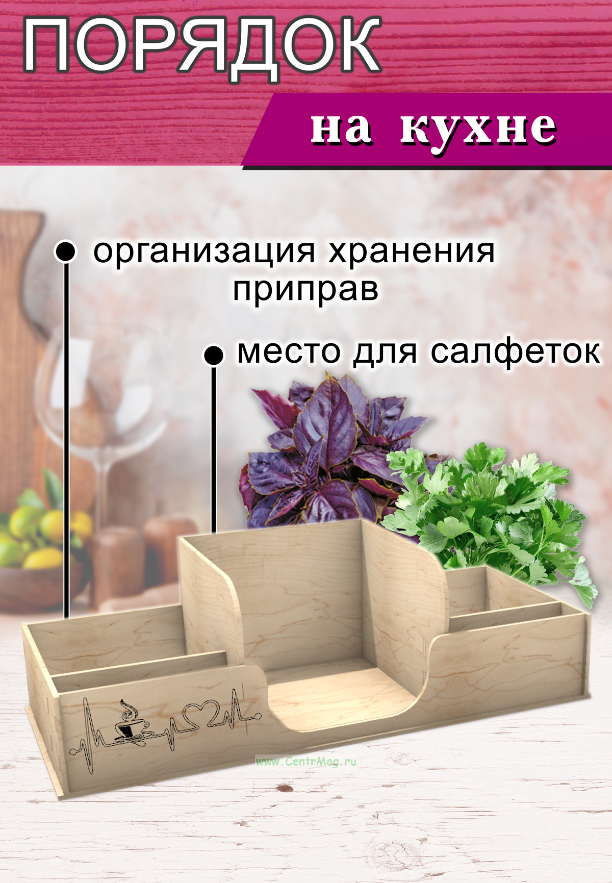 Дизайнерский органайзер для специй поможет организовать хранение приправ и салфеток, а также обеспечить порядок на кухне. Контейнер позволяет хранить салфетки или баночки с ароматным маслом, солью и перцем. В маленький отсек можно поставить ароматное масло для салатов, солонки и перечницы. Приятный натуральный дизайн контейнера дополнит любой интерьер и придаст ему домашний уют. Оптимальный размер позволяет расположить органайзер, как на столе, так и на полке шкафа.