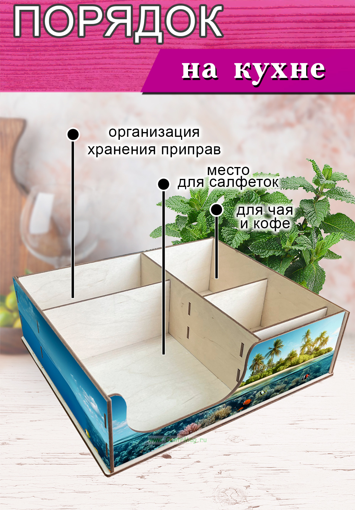 Дизайнерский органайзер для специй поможет организовать хранение приправ и салфеток, а также обеспечить порядок на кухне. Контейнер позволяет хранить салфетки или баночки с ароматным маслом, солью и перцем. В маленький отсек можно поставить ароматное масло для салатов, солонки и перечницы. Приятный натуральный дизайн контейнера дополнит любой интерьер и придаст ему домашний уют. Оптимальный размер позволяет расположить органайзер, как на столе, так и на полке шкафа.