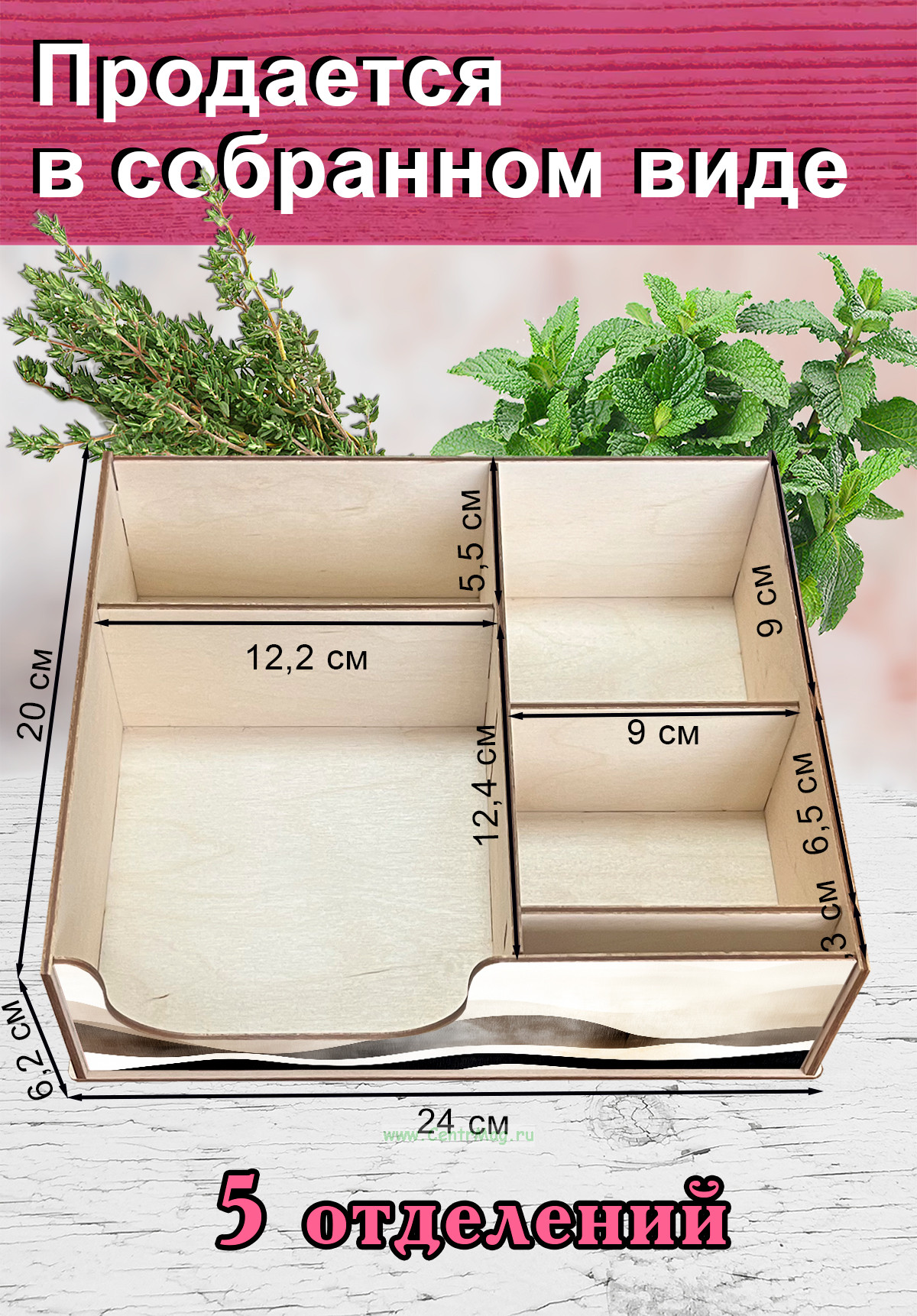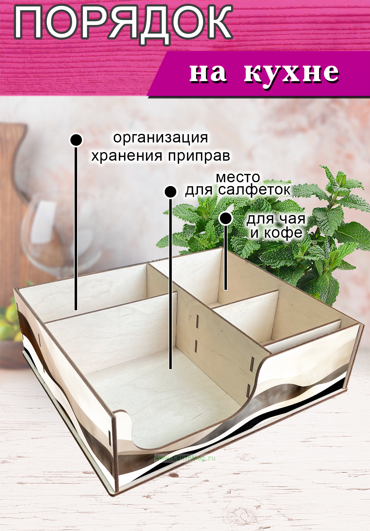 Дизайнерский органайзер для специй поможет организовать хранение приправ и салфеток, а также обеспечить порядок на кухне. Контейнер позволяет хранить салфетки или баночки с ароматным маслом, солью и перцем. В маленький отсек можно поставить ароматное масло для салатов, солонки и перечницы. Приятный натуральный дизайн контейнера дополнит любой интерьер и придаст ему домашний уют. Оптимальный размер позволяет расположить органайзер, как на столе, так и на полке шкафа.