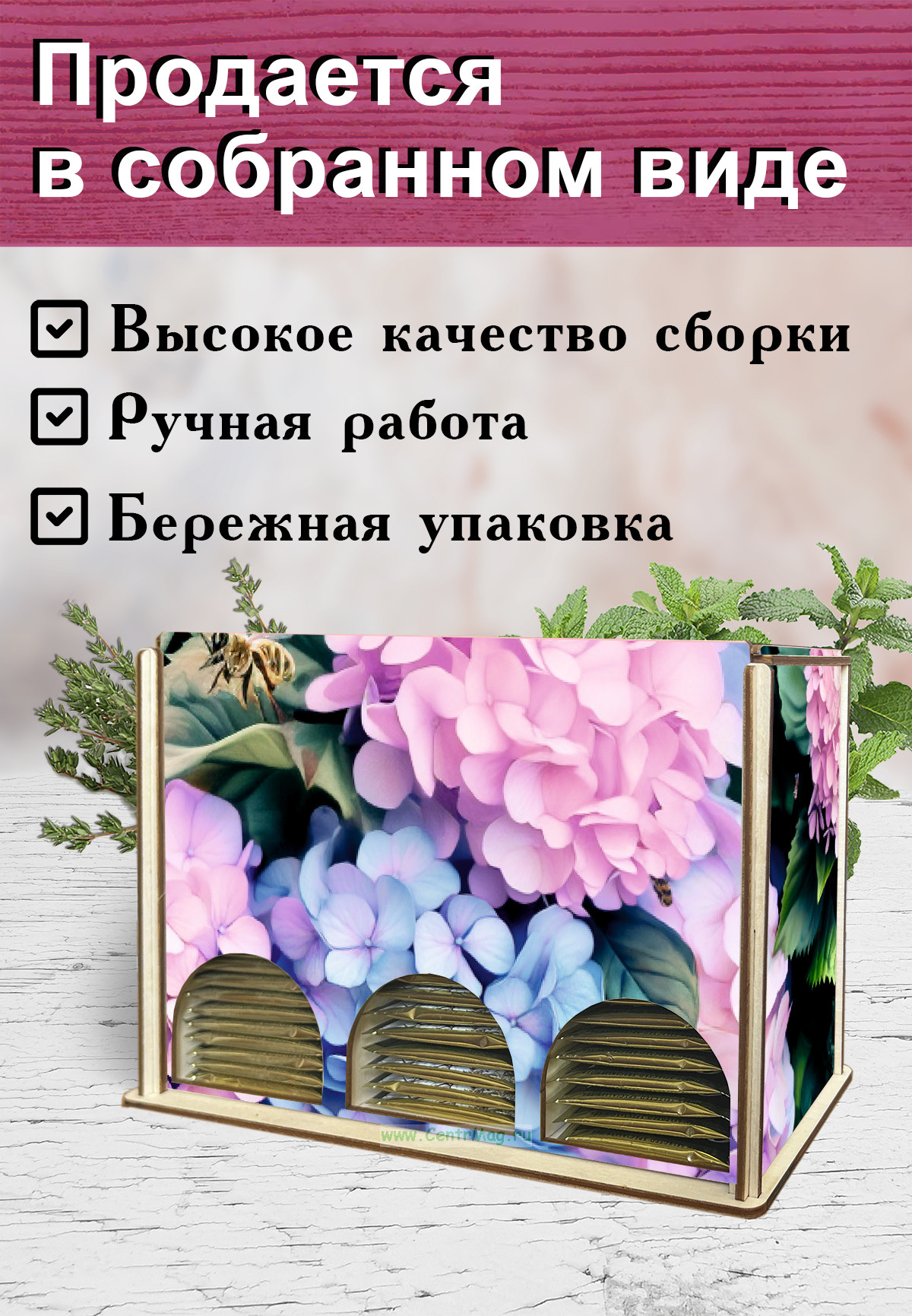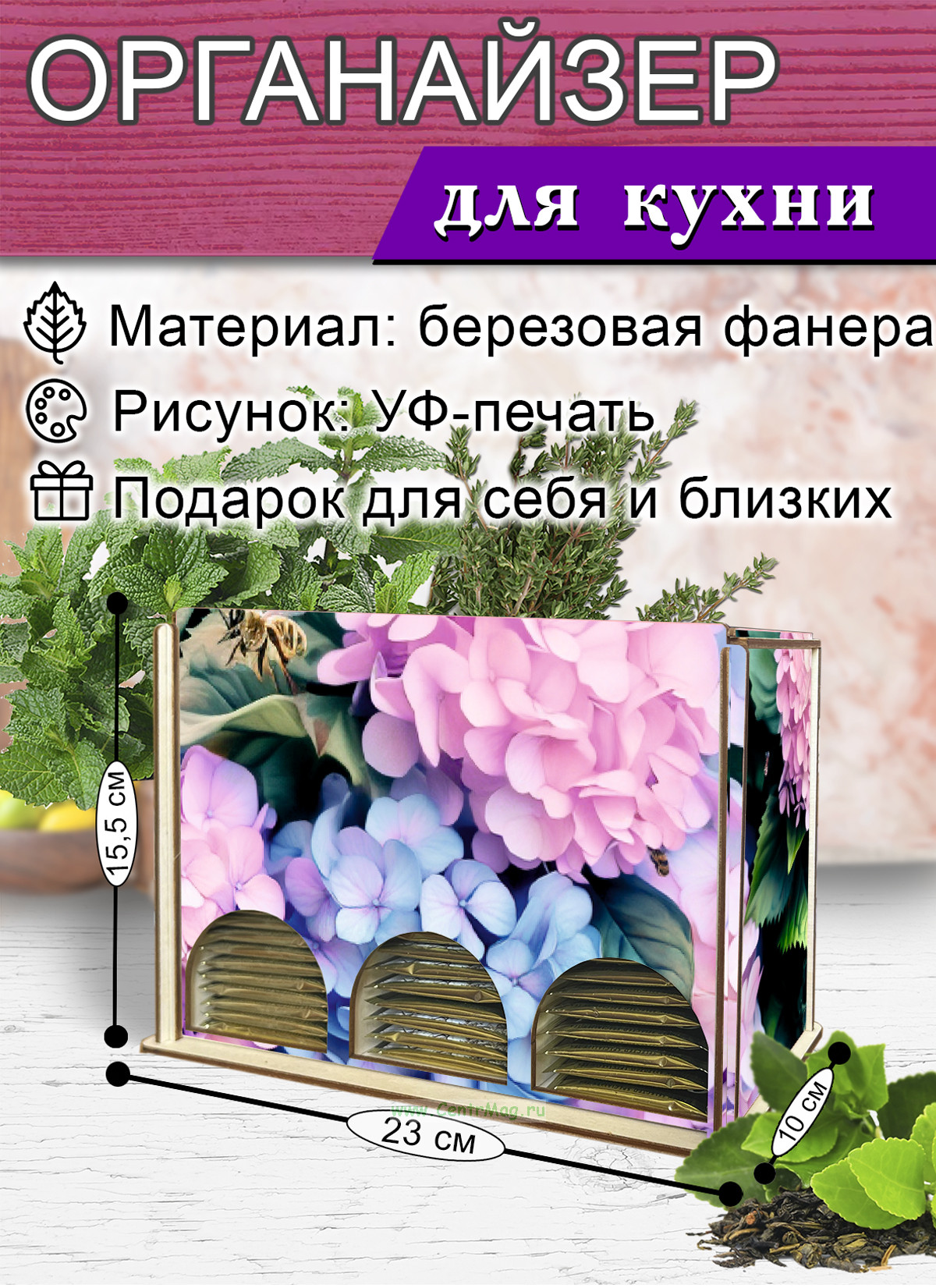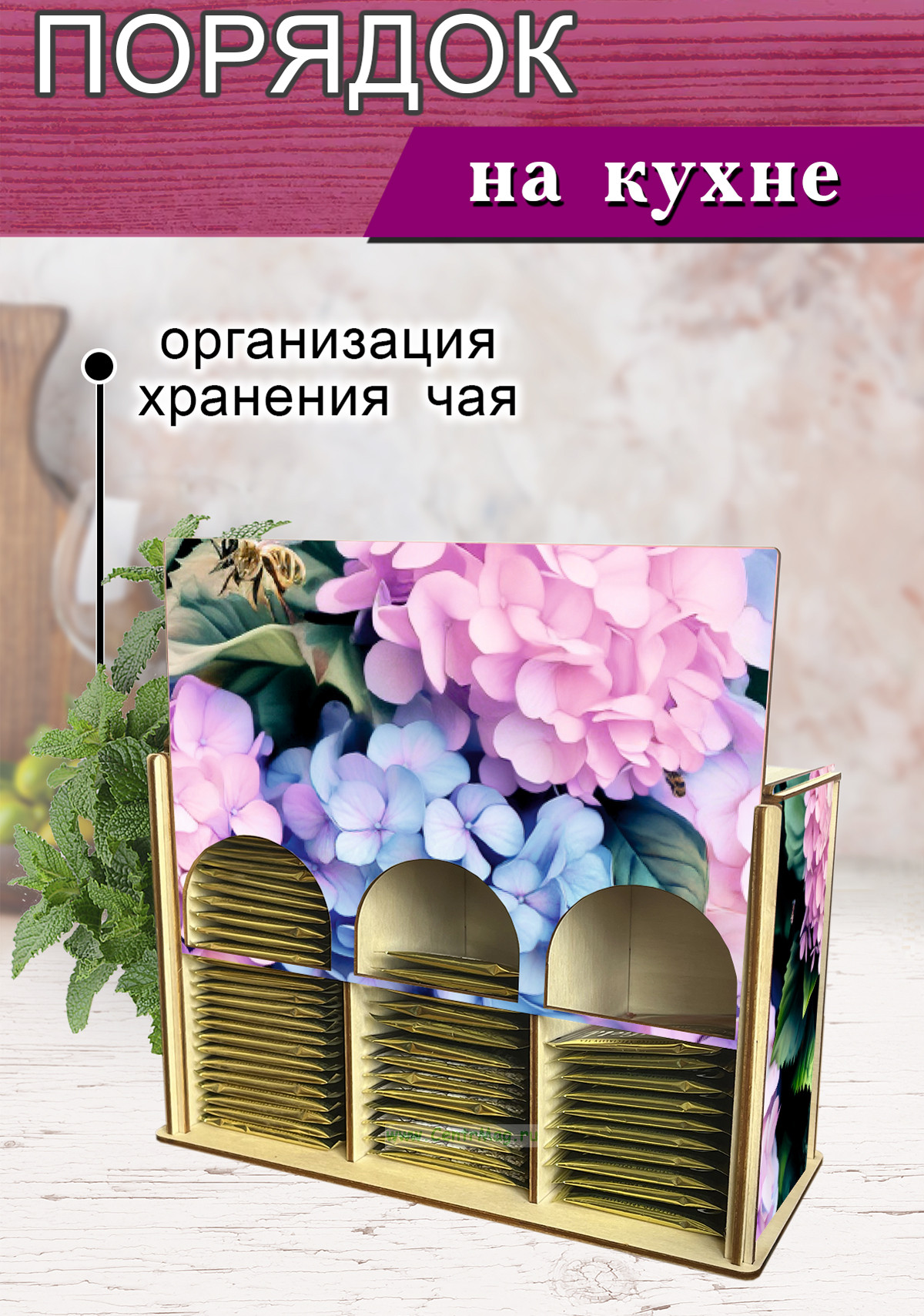 Органайзер для чайных пакетиков "Гортензия", 23х13х8 см, 3 отсека (353 руб.)