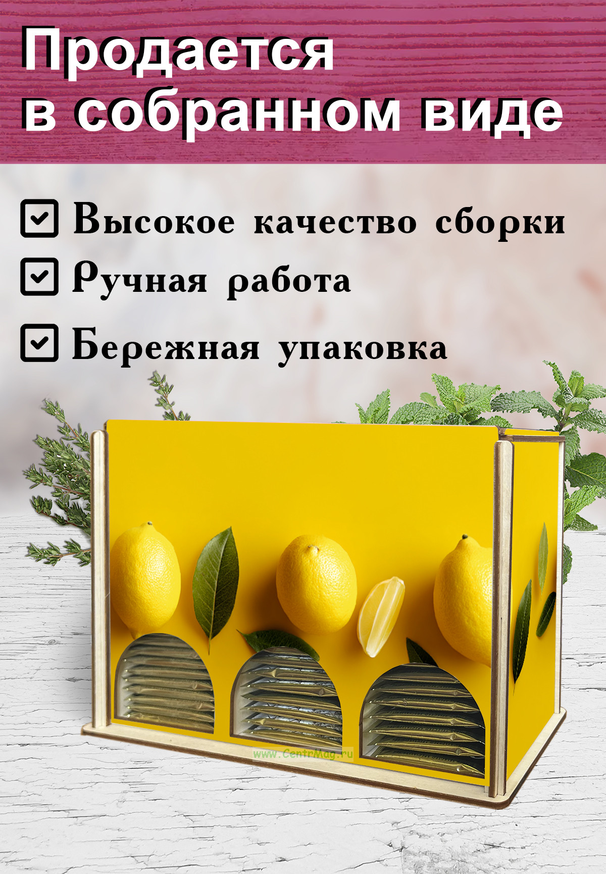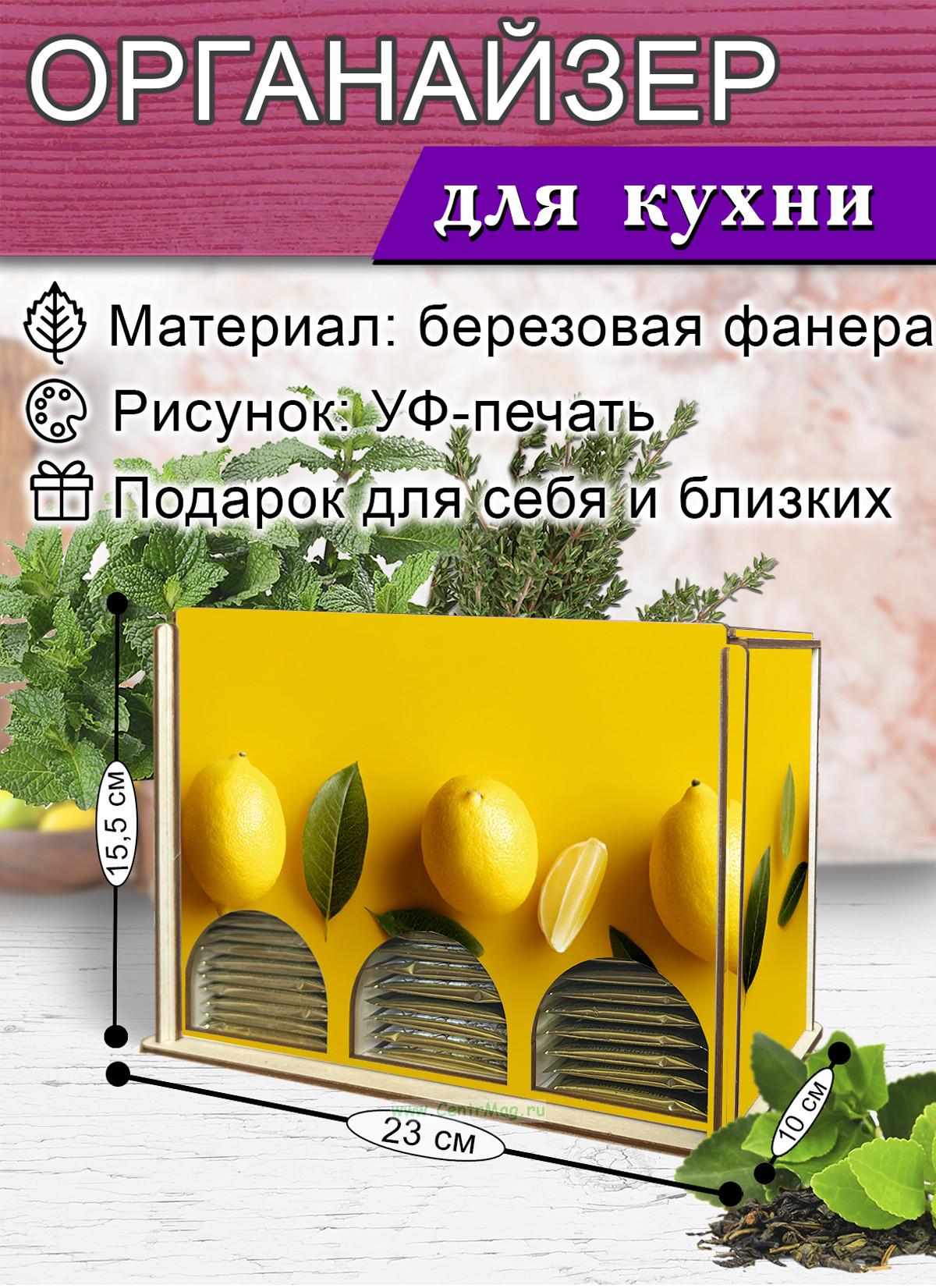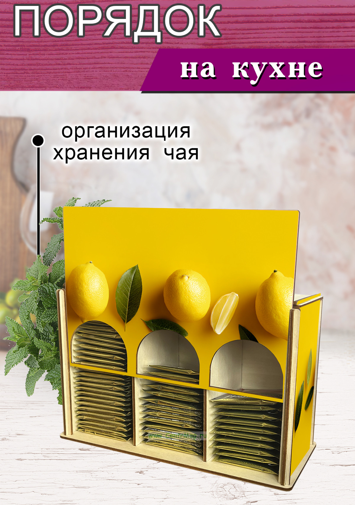 Органайзер для чайных пакетиков вертикальный "Лимончики" (резной), 15,5 х 9 х 23,1 см (453 руб.)