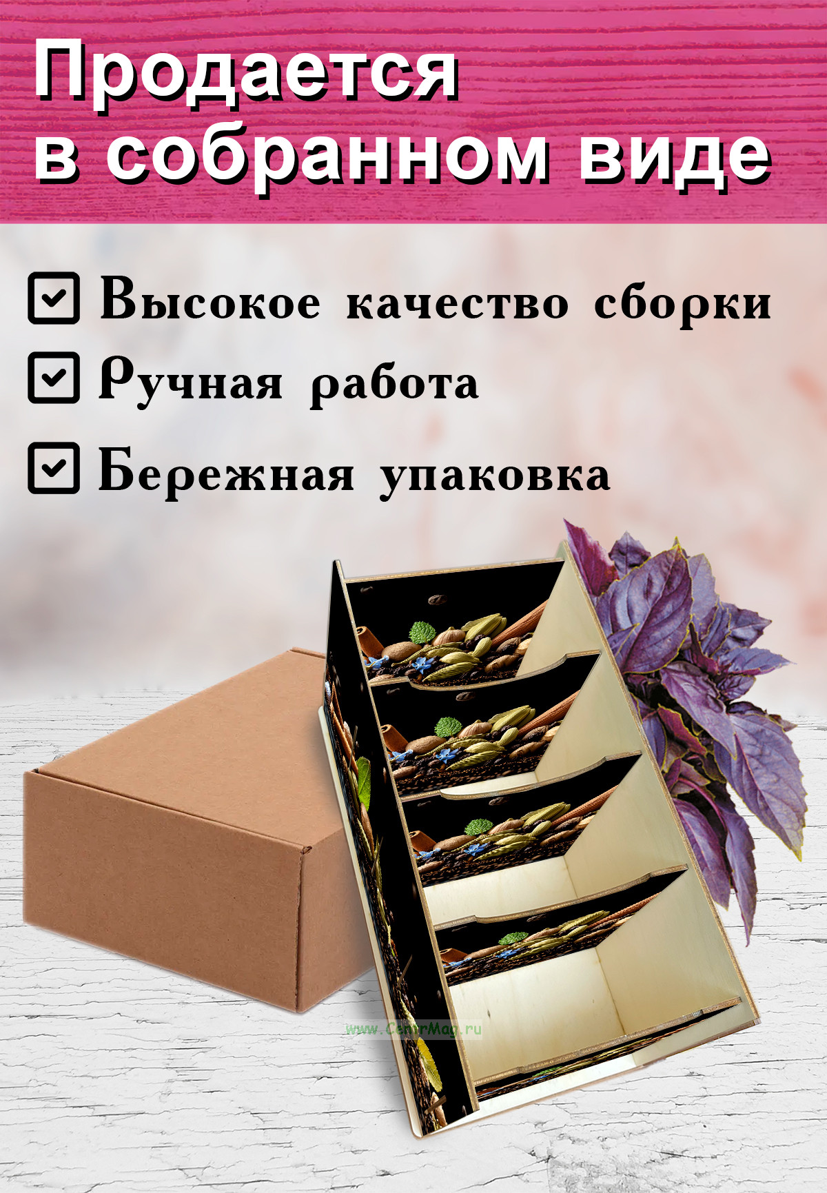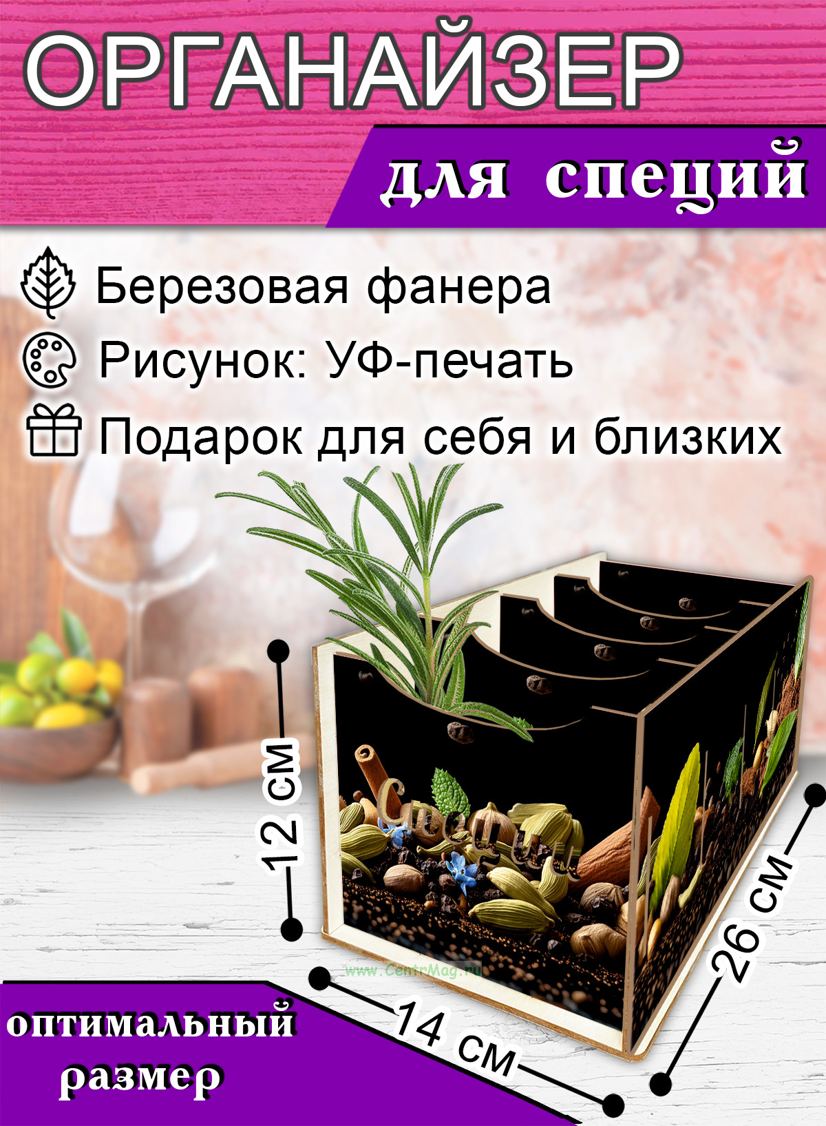 Дизайнерский органайзер для специй поможет организовать хранение приправ и обеспечить порядок на кухне. Контейнер вмещает в себя большое количество душистых пакетиков с орегано, сушеным базиликом, чесноком и другими пряностями. Приятный натуральный дизайн контейнера дополнит любой интерьер и придаст ему домашний уют. Оптимальный размер позволяет расположить органайзер, как на столе, так и на полке шкафа.