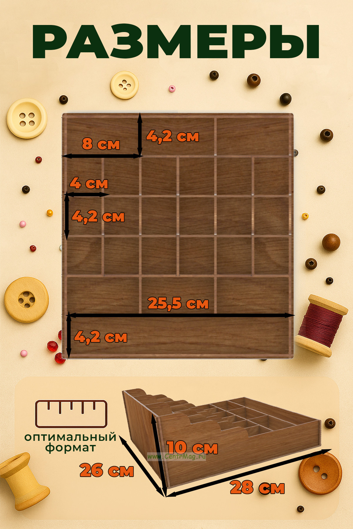 Деревянный органайзер "Мастер Порядка" — идеальное решение для хранения и сортировки мелких предметов: фурнитуры, метизов, рукодельных принадлежностей, канцелярии, швейных нитей, украшений и других товаров. Многоуровневая конструкция с ячейками разного размера позволяет удобно организовать рабочее пространство и моментально находить нужное.