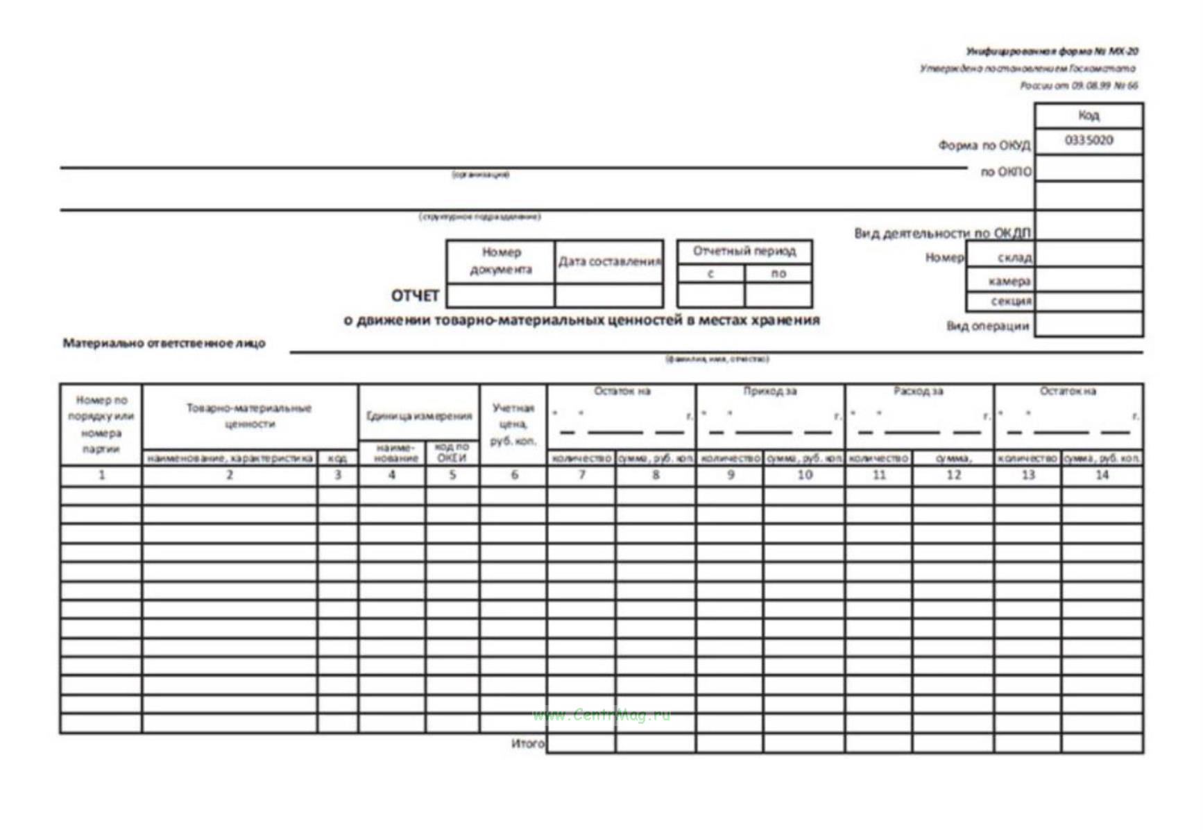 Бланк Отчета о движении товарно-материальных ценностей в местах хранения (Форма МХ-20) соответствует Постановлению Росстата от 09.08.1999 № 66 "Об утверждении унифицированных форм первичной учетной документации по учету продукции, товарно-материальных ценностей в местах хранения"
