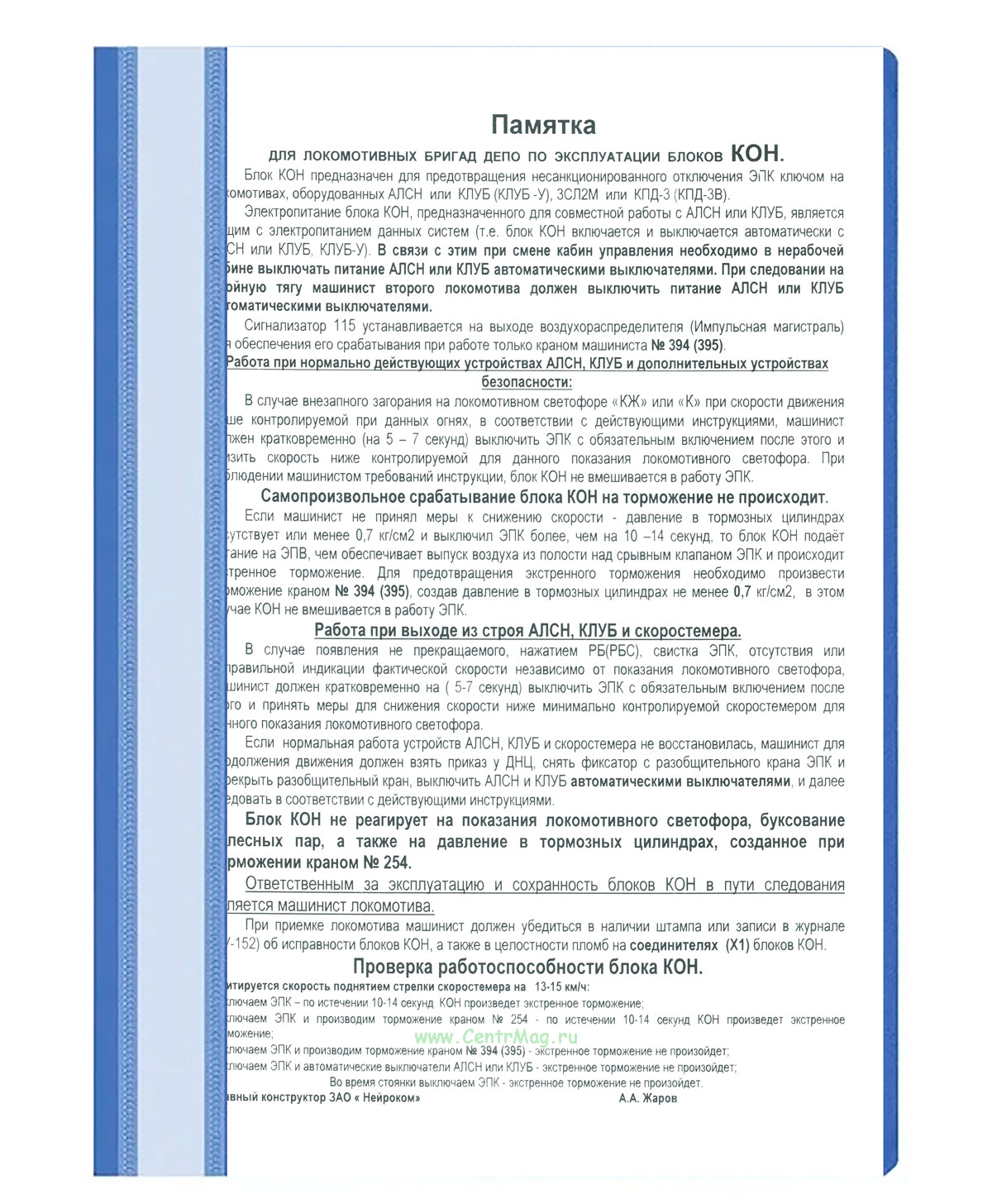 Памятка для локомотивных бригад депо эксплуатации блоков КОН