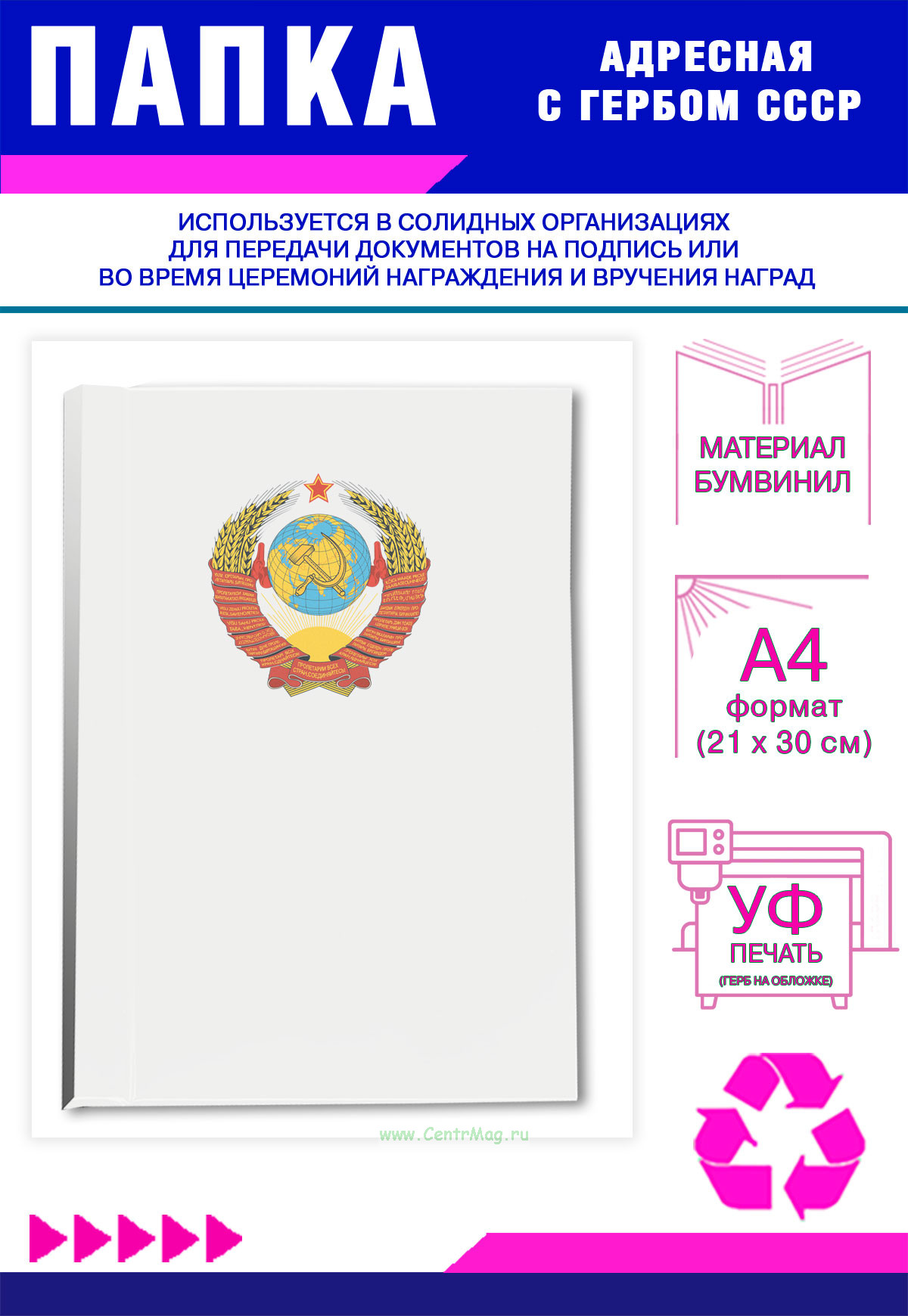 Адресная папка с гербом СССР выполнена из высококачественного картона, покрытого плотным материалом и украшена гербом СССР, нанесённым с помощью УФ-печати.