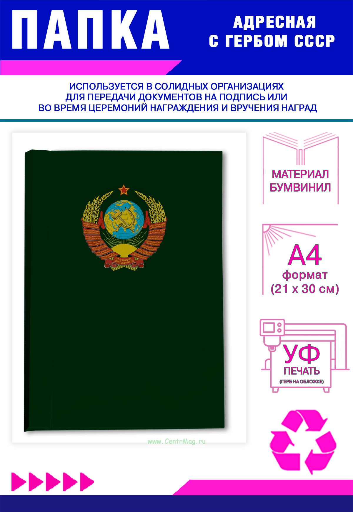 Адресная папка с гербом СССР выполнена из высококачественного картона, покрытого плотным материалом и украшена гербом СССР, нанесённым с помощью УФ-печати.
