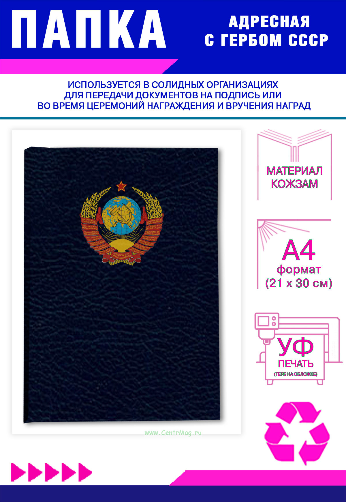 Адресная папка с гербом СССР выполнена из высококачественного картона, покрытого плотным материалом и украшена гербом СССР, нанесённым с помощью УФ-печати.