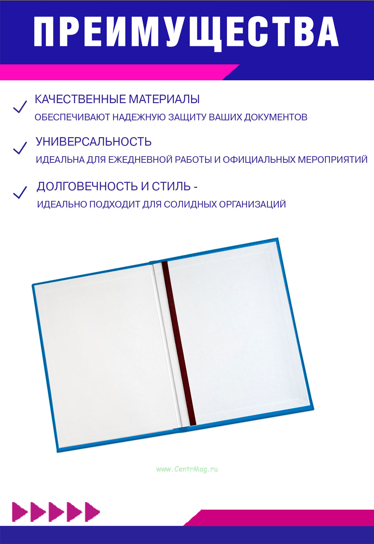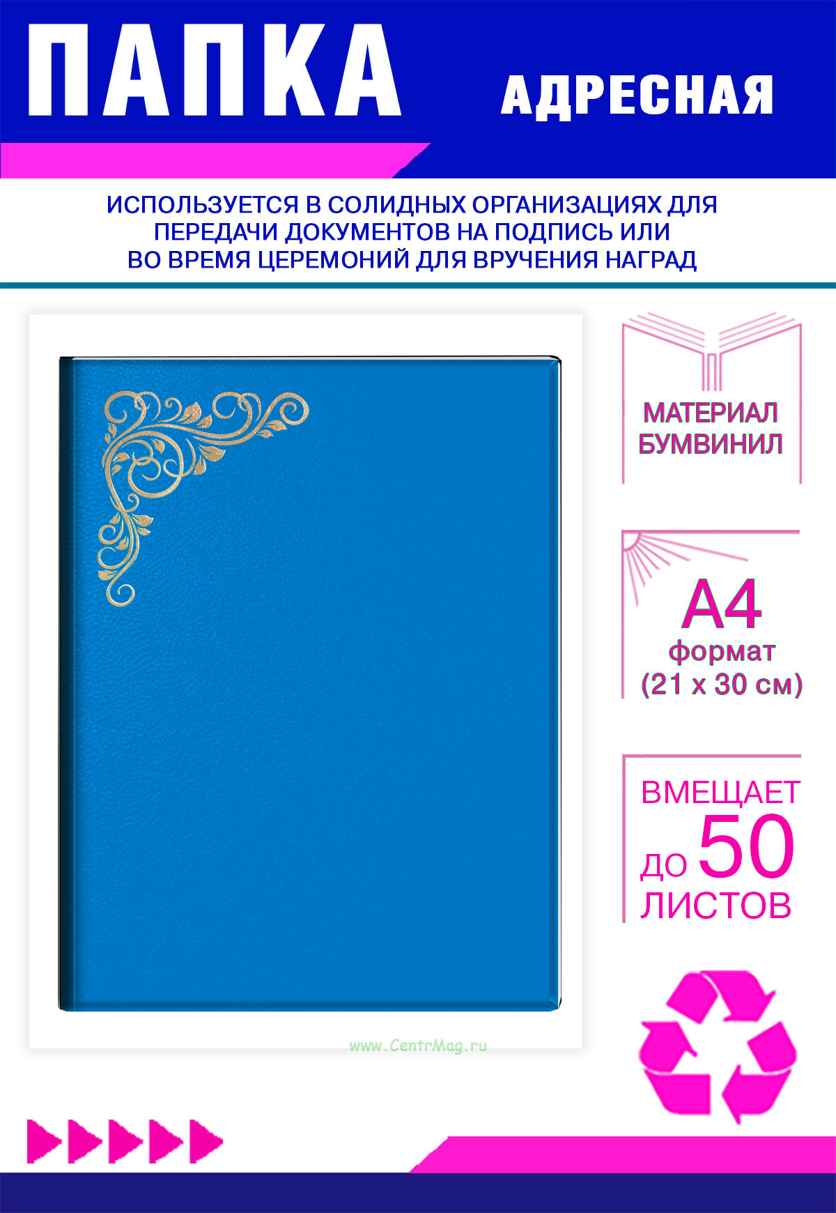 Папка адресная с гербом России используется в солидных организациях для передачи документов на подпись или во время церемоний награждения и вручения наград. Обложка сделана из высококачественного картона, покрытого бумвинилом. На лицевой стороне папки с помощью золотого тиснения нанесен узор.