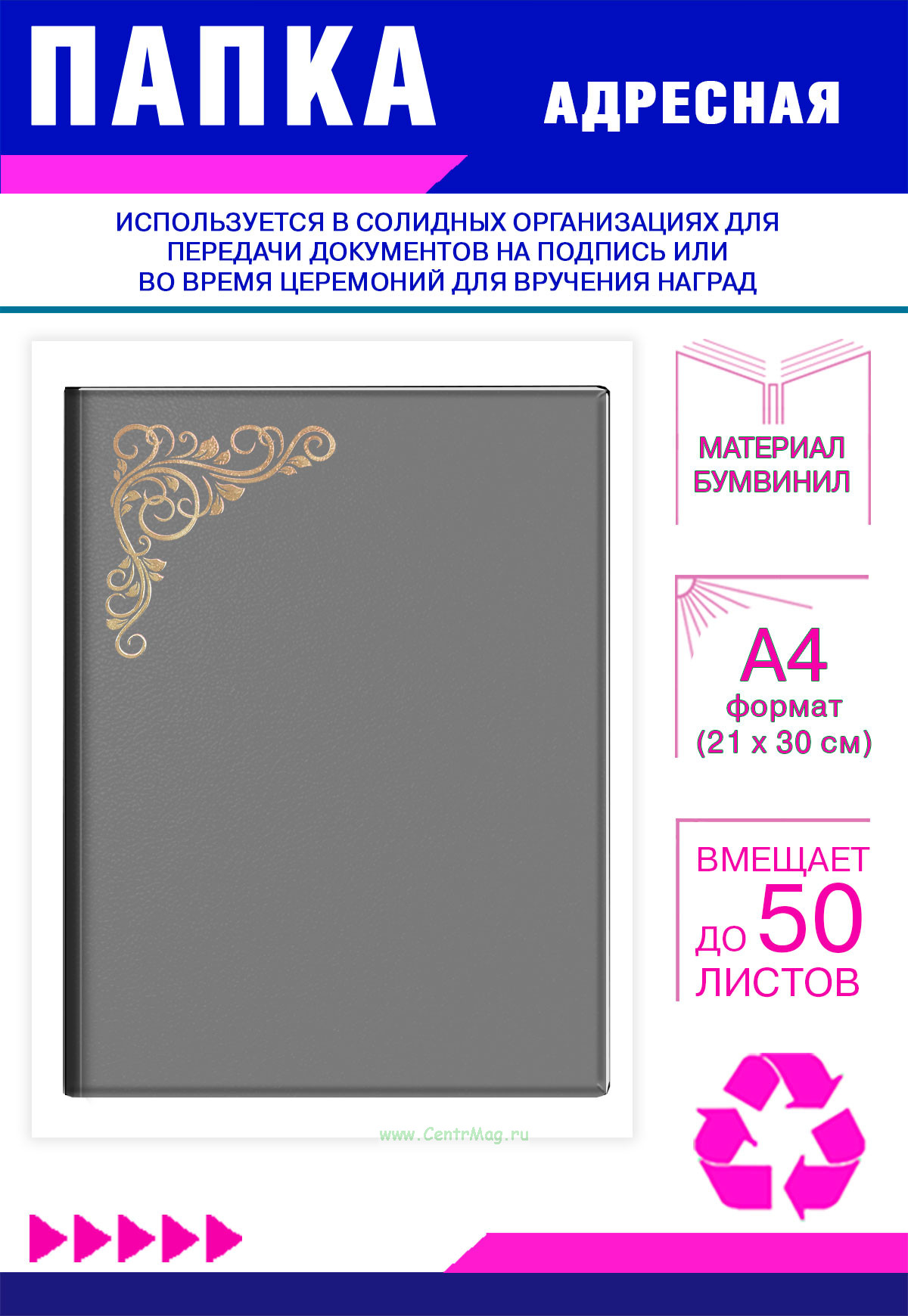 Папка адресная с гербом России используется в солидных организациях для передачи документов на подпись или во время церемоний награждения и вручения наград. Обложка сделана из высококачественного картона, покрытого бумвинилом. На лицевой стороне папки с помощью золотого тиснения нанесен узор.