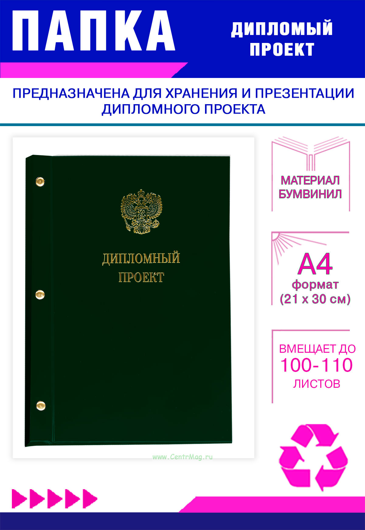 Папка "Дипломный проект" с гербом РФ, А4, зеленый бумвинил, 100-110 листов