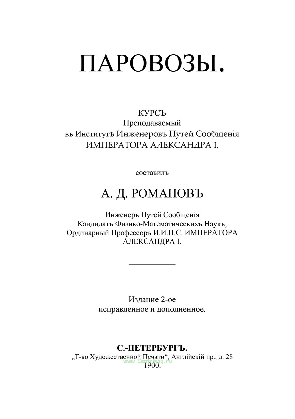 На мою долю выпала обязанность преподавать въ Институте Инженеровъ Путей Сообшенія ИМПЕРАТОРА АЛЕКСАНДРА I отделы прикладной механики, име ющіе предметомъ своимъ машины для переме щенія грузовъ, а именно: подъемныя машины и, по смерти Л. А. Еракова, паровозы.