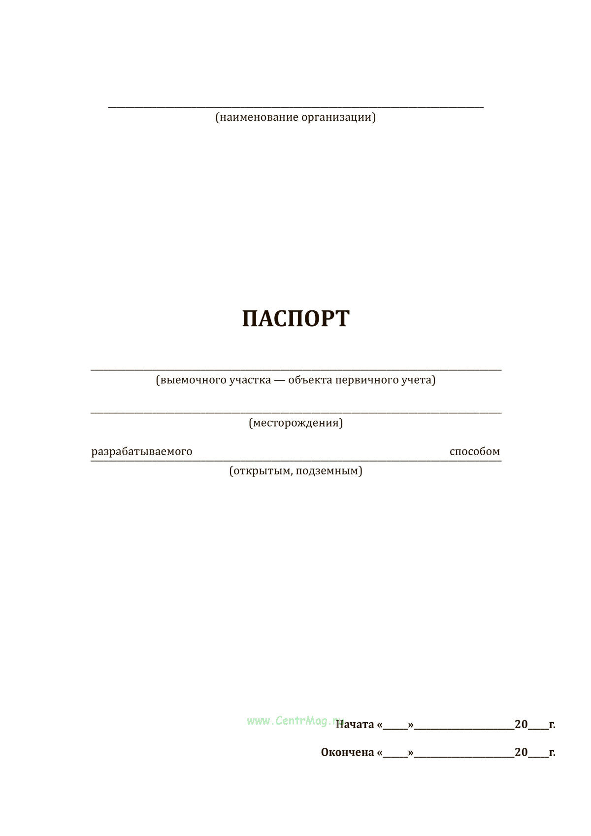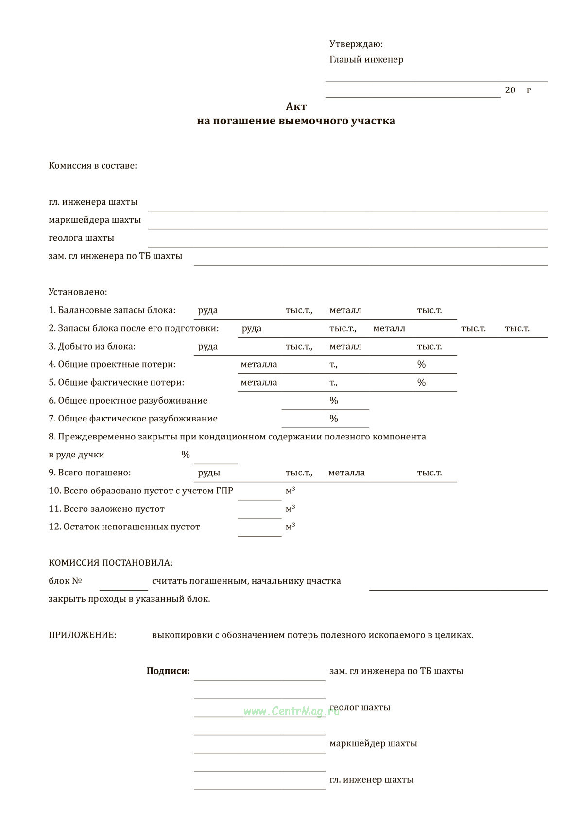 Паспорт на геологический блок представляет собой технический документ, предназначенный для систематизации и учета информации о конкретном выемочном участке месторождения полезных ископаемых. Он оформляется при начале освоения блока и сопровождает его на всех этапах — от подготовки до завершения добычных работ. В паспорте фиксируются характеристики блока (размеры, площадь, система разработки), геологическое строение, сведения о запасах (по категориям, содержанию полезных компонентов), данные по приросту и списанию запасов, а также информация о движении запасов в процессе эксплуатации. Паспорт также включает акт на погашение блока после завершения его разработки. Документ используется в оперативной и отчетной деятельности геологов, маркшейдеров и инженерного состава горнодобывающих предприятий.