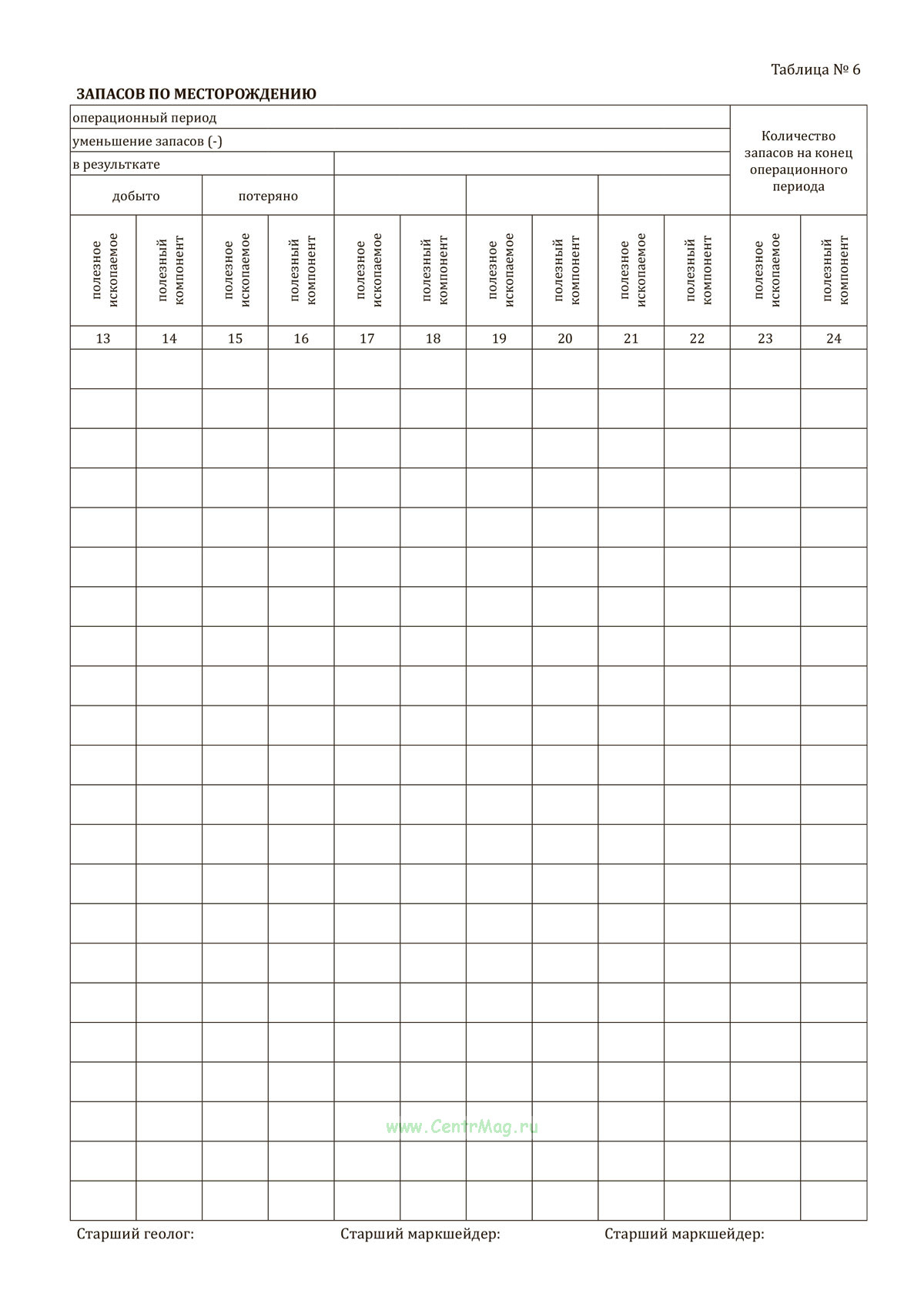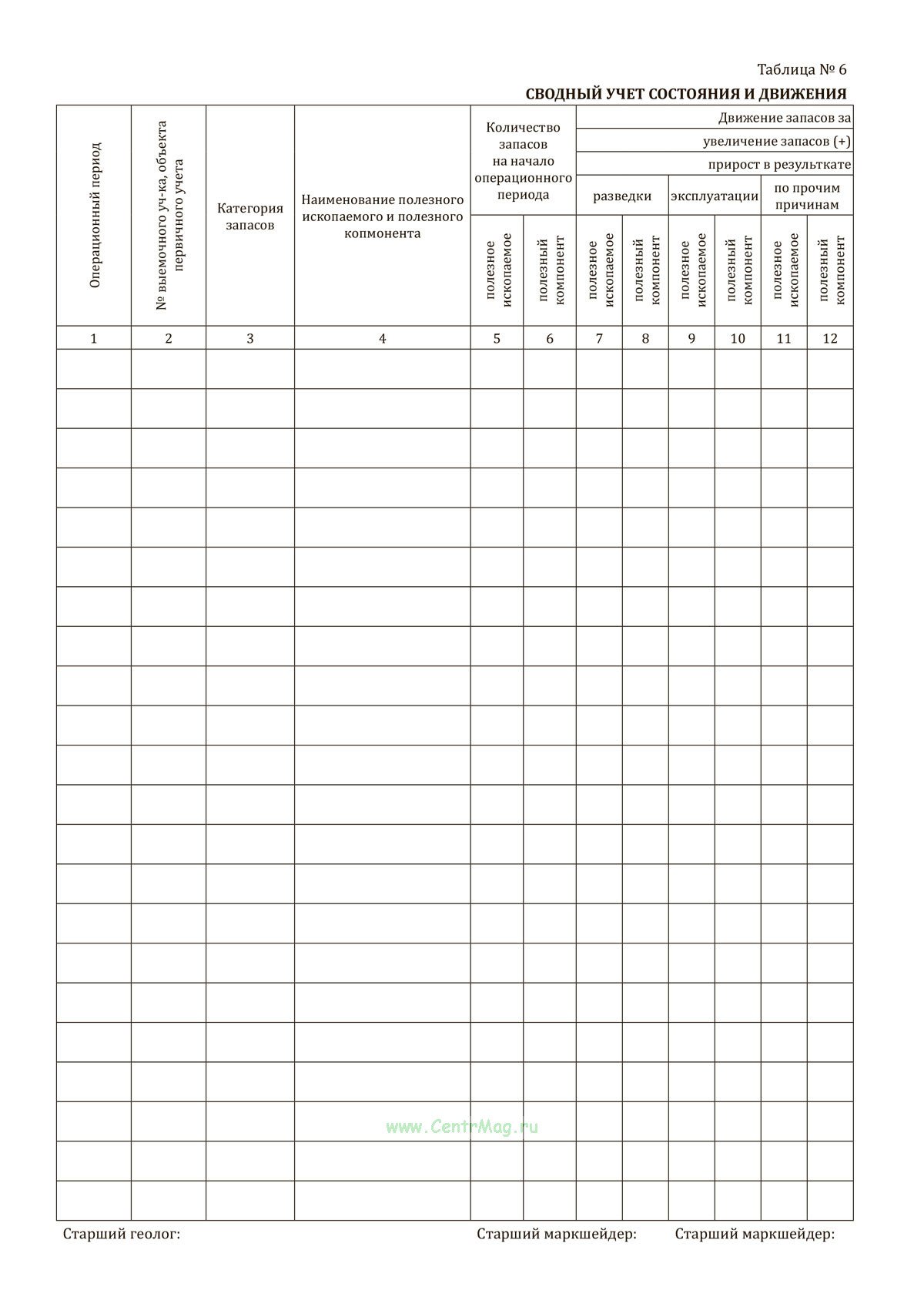 - Таблица №6. Сводный учет состояния и движения запасов по месторождению.