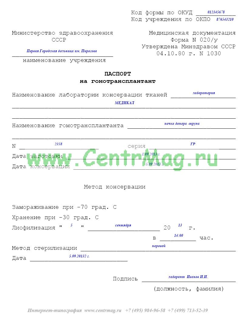 Форма паспорта на гомотрансплантант (Форма 020/у) утверждена Приказом Минздрава СССР № 1030 «Об утверждении форм первичной медицинской документации учреждений здравоохранения» от 04 октября 1980 (с изменениями на 31 декабря 2002 года)., который утратил силу.