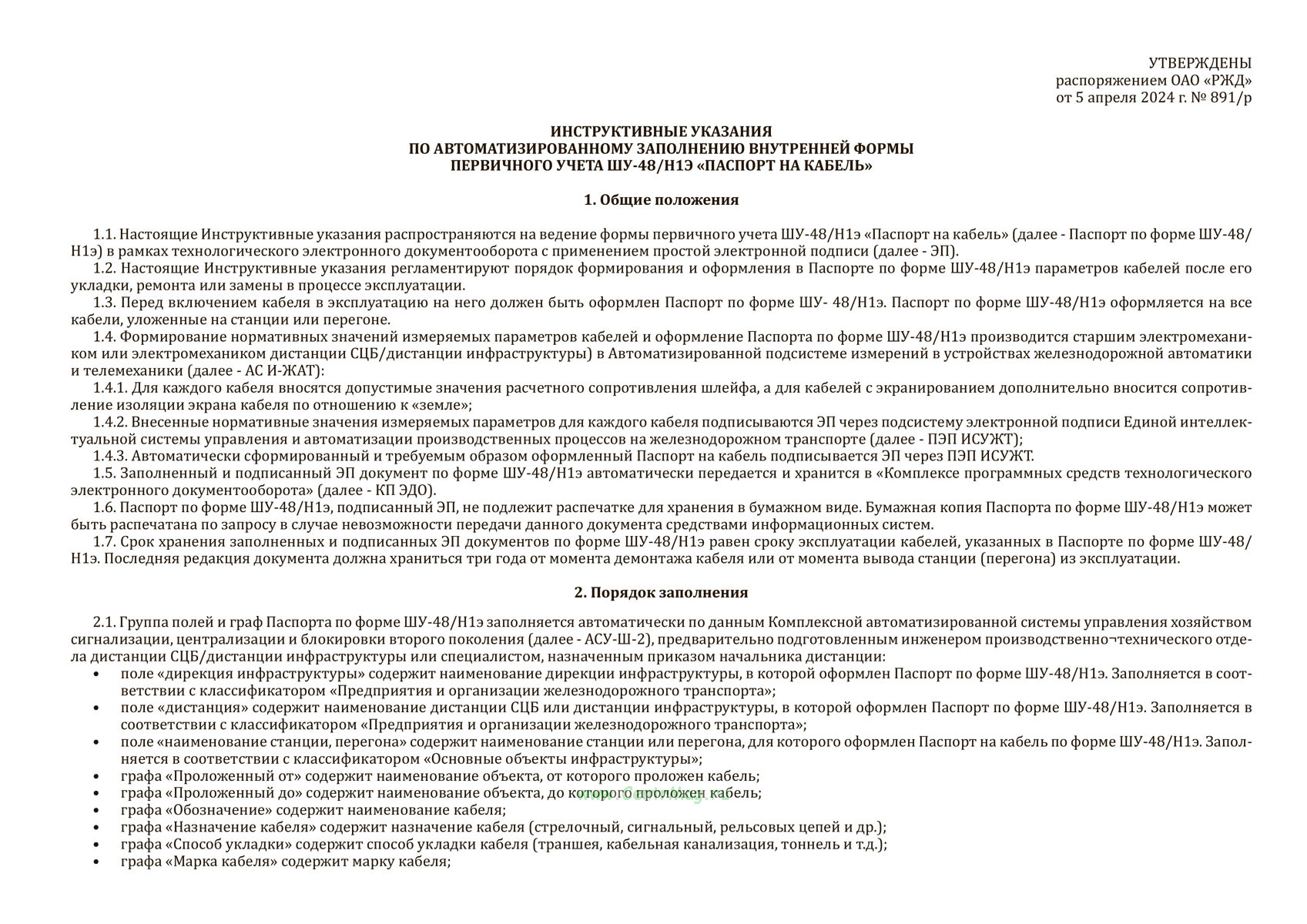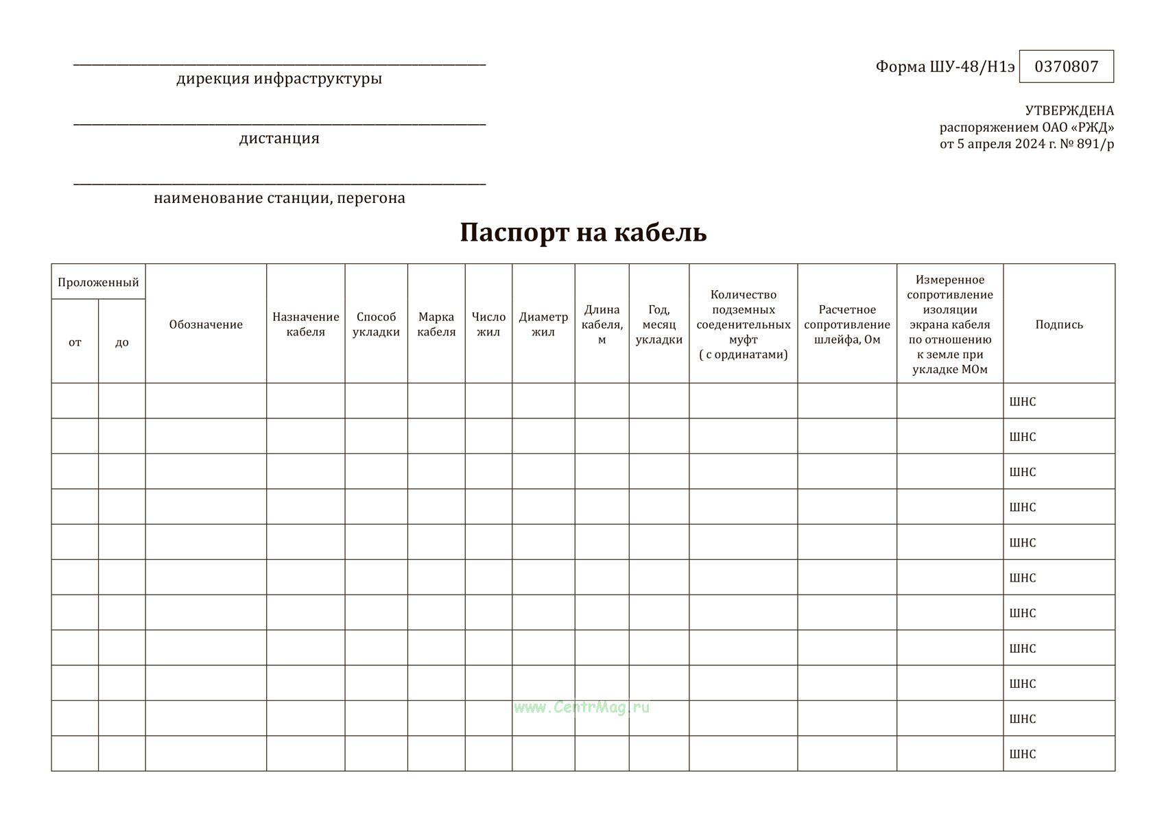 Форма паспорта на кабель (ШУ-48/Н1э) утверждена распоряжением ОАО "РЖД" от 5 апреля 2024 г. № 891/р "Об утверждении форм внутреннего первичного учета ОАО "РЖД" в хозяйстве автоматики и телемеханики"