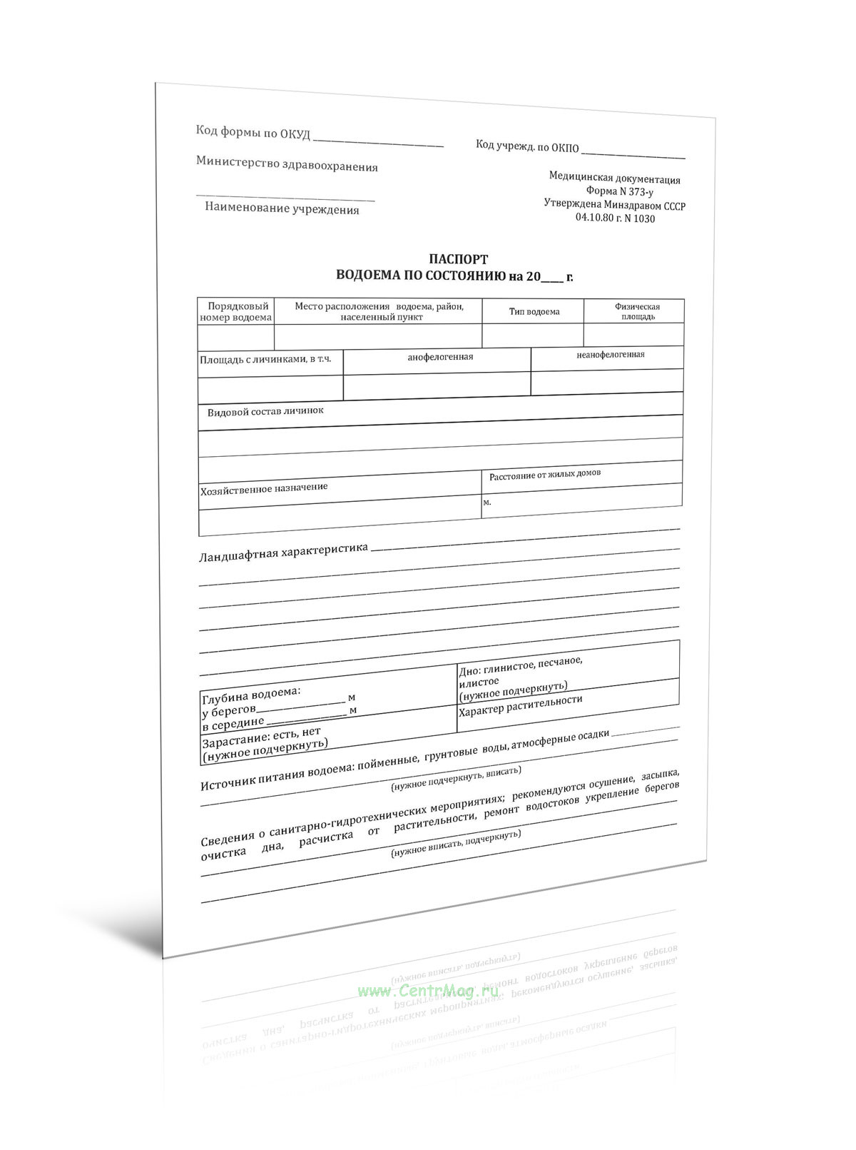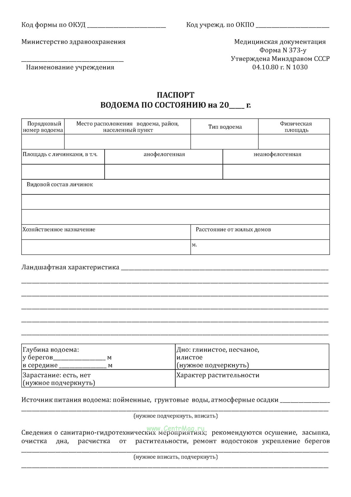 Форма паспорта водоема (Форма N 373-у) утверждена приказом Минздрава СССР №1030 "Об утверждении форм первичной медицинской документации учреждений здравоохранения" от 4 октября 1980 г, который утратил силу.