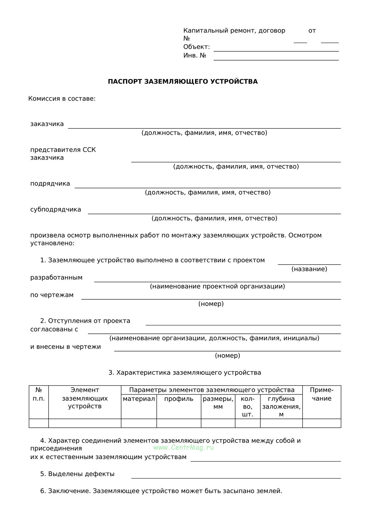 Паспорт предназначен для фиксации результатов осмотра и оценки соответствия выполненных работ по устройству заземления проектной и нормативной документации. В документе отражаются характеристики заземляющих элементов, глубина их заложения, материал, профиль, параметры соединений и наличие (или отсутствие) дефектов. Паспорт подтверждает, что заземляющее устройство смонтировано в соответствии с проектом, безопасно и готово к засыпке. Он оформляется комиссией с участием представителей заказчика, подрядчика и субподрядчика и входит в состав исполнительной документации.