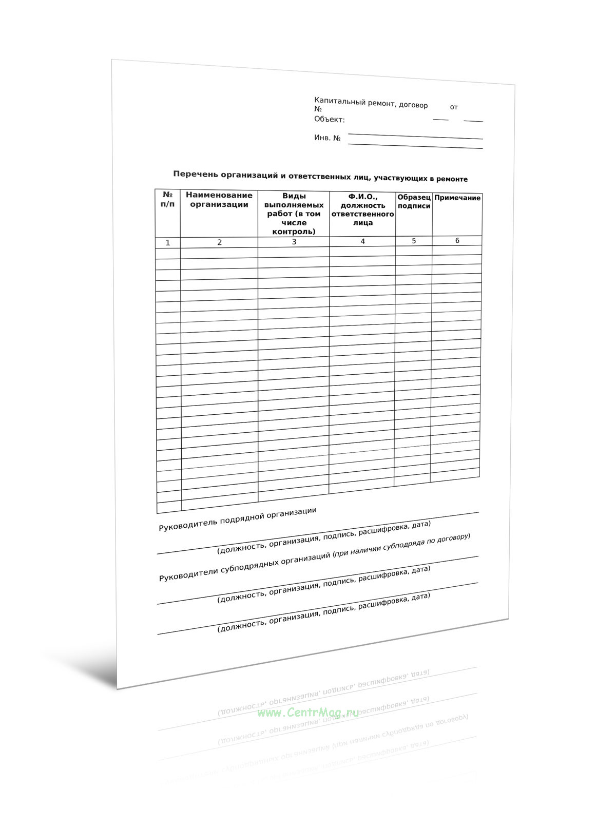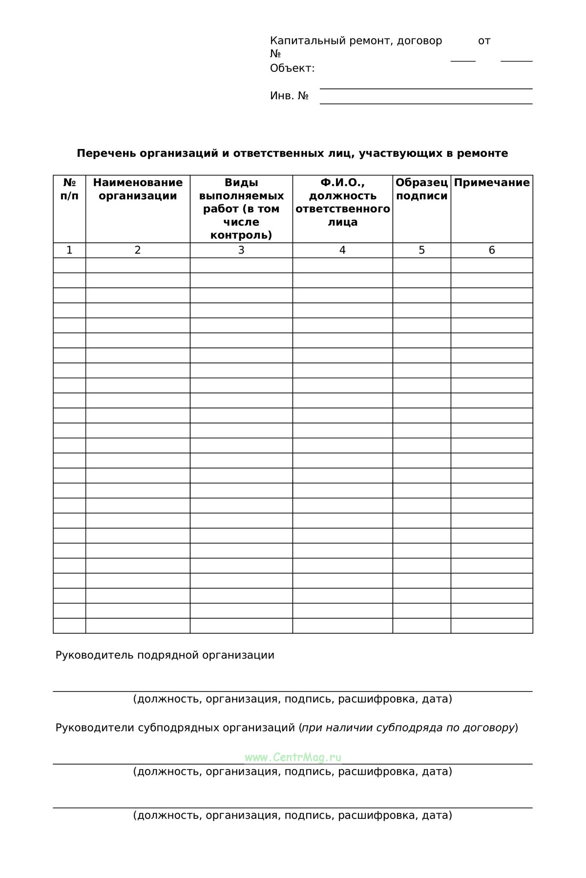Перечень организаций и ответственных лиц, участвующих в текущем ремонте (Форма Г.10)
