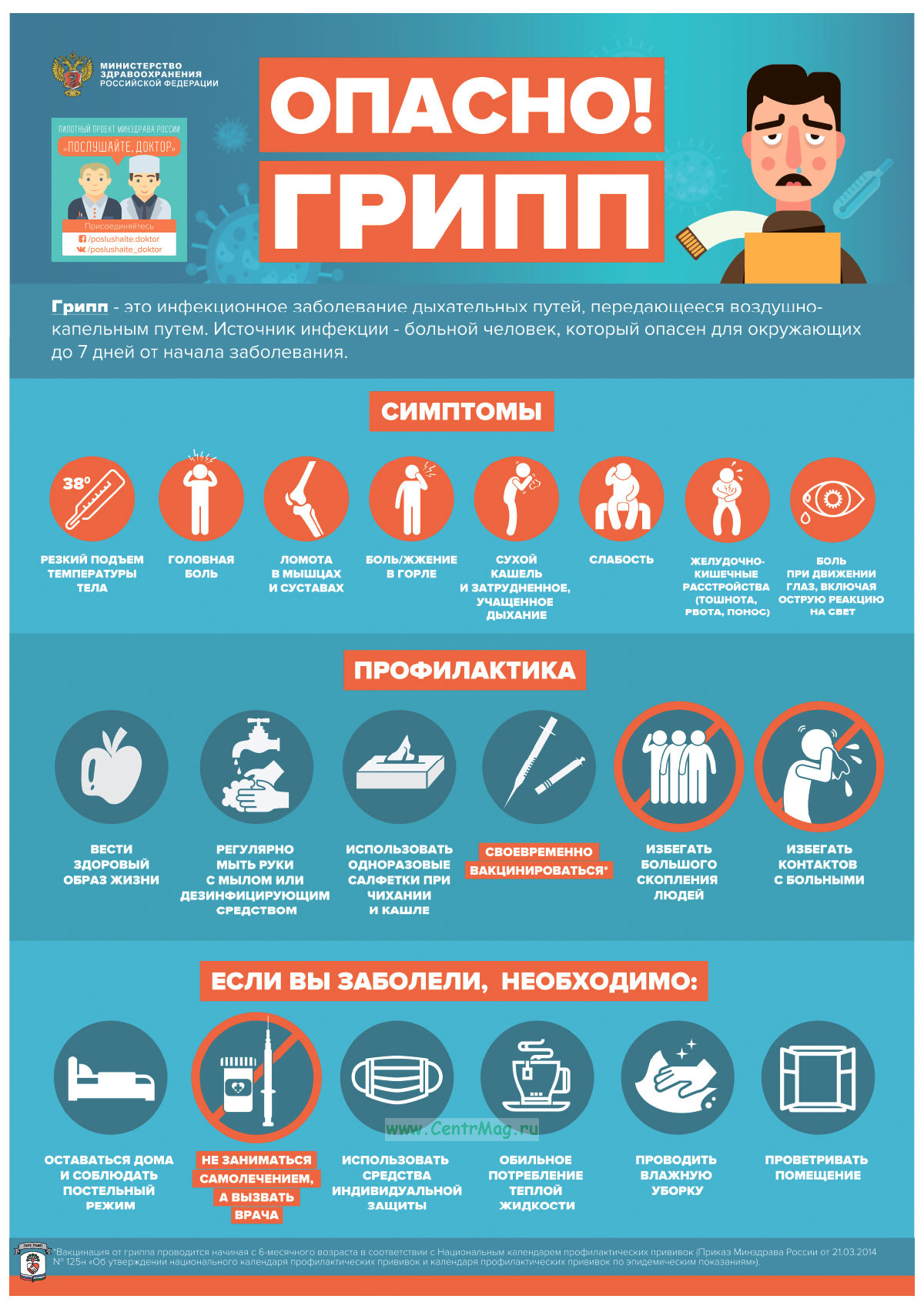 Плакат "Опасно! Грипп" - информационный материал, предназначенный для повышения осведомленности о симптомах, профилактике и действиях при заболевании гриппом. Визуально яркий и легко воспринимаемый, этот плакат подробно описывает основные симптомы заболевания, такие как повышение температуры, головная боль, ломота в мышцах, боль в горле, сухой кашель и слабость. Также представлены рекомендации по профилактике: здоровый образ жизни, регулярная гигиена, использование одноразовых средств защиты и своевременная вакцинация.