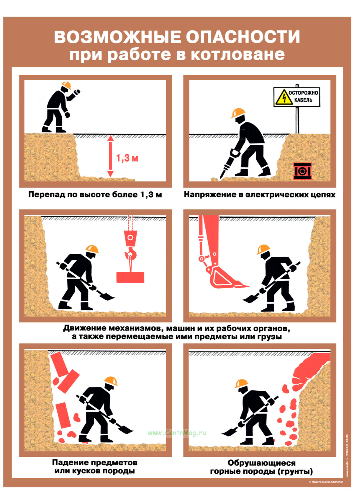 Плакат "Возможные опасности при работе в котловане" представляет собой информативный и наглядный продукт, предназначенный для обеспечения безопасности на строительных и земельных работах. Он предупреждает о возможных рисках, с которыми могут столкнуться работники в котлованах, и напоминает о мерах предосторожности.