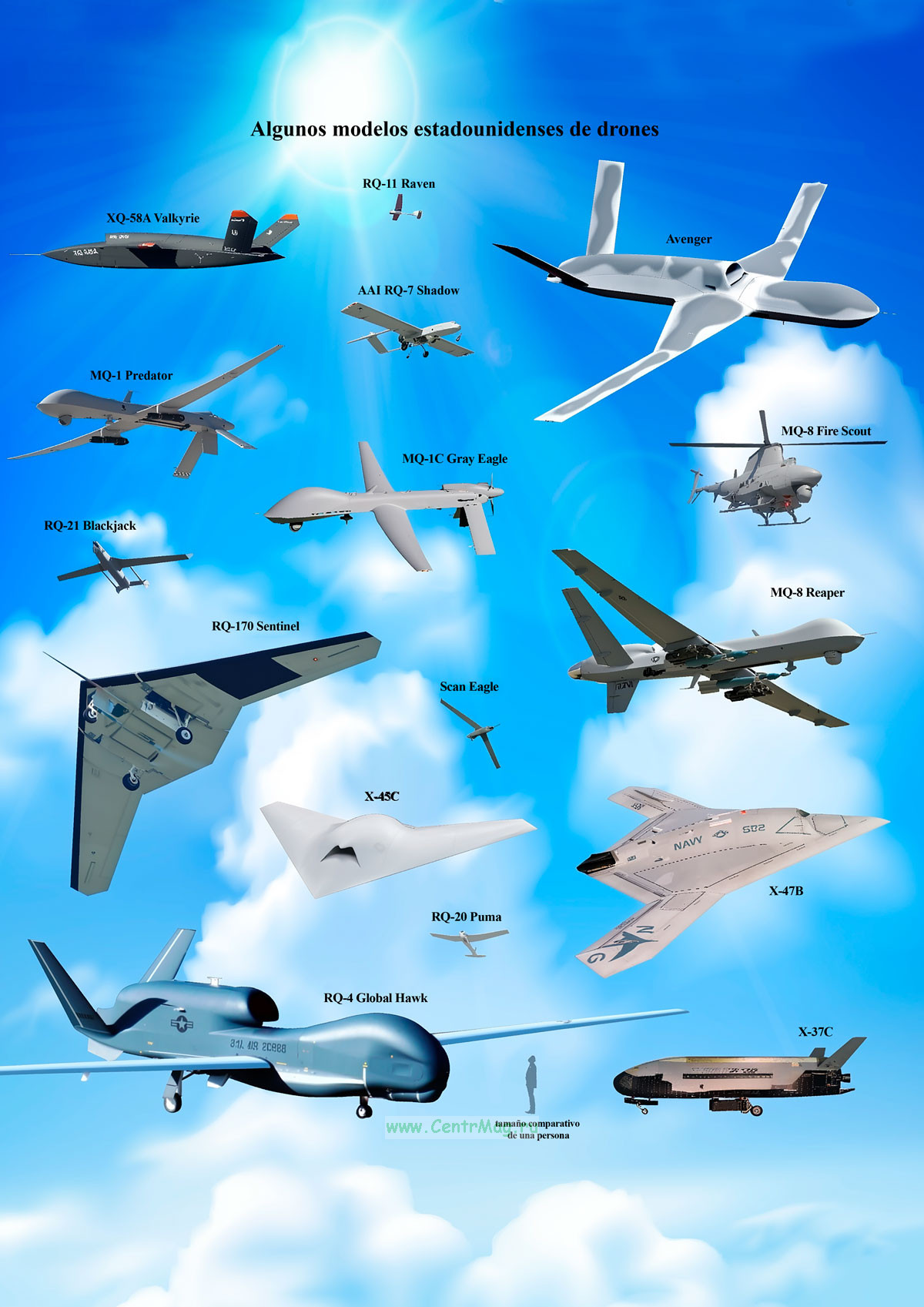 Плакат показывает разнообразные модели американских дронов разных размеров и назначений с сравнением их масштаба с человеком.