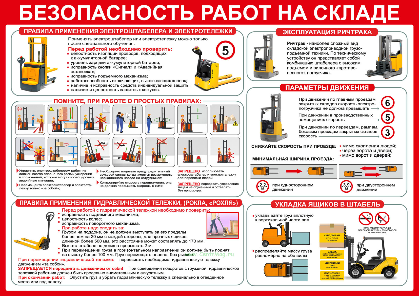 Плакат "Безопасность работ на складе" наглядно отображает основные требования и правила безопасной эксплуатации складской техники и организации труда на складе. На нем представлены инструкции по использованию электро-штабелера, электротележки, ричтрака и гидравлической тележки, а также рекомендации по укладке грузов и безопасному передвижению по складским проездам.