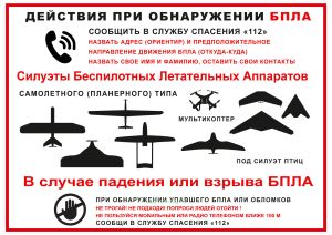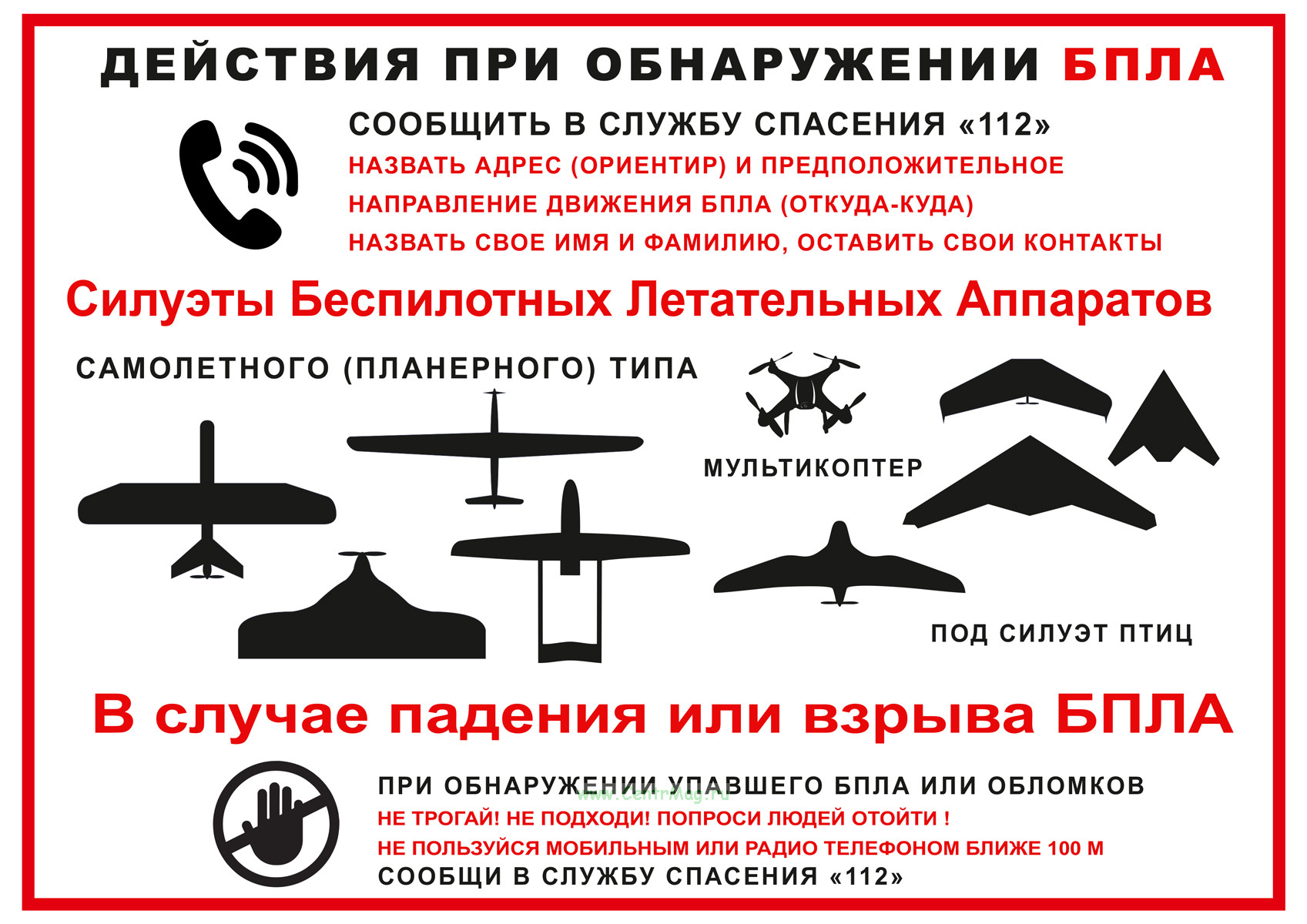 Плакат "Действия при обнаружении БПЛА" - памятка, предназначенная для быстрого и понятного ознакомления с необходимыми действиями в случае обнаружения беспилотного летательного аппарата, при падении или взрыве БПЛА. В ней подробно изложены рекомендации по безопасному реагированию. На плакате также представлены основные типы беспилотных летательных аппаратов и их обозначения для быстрого распознавания. Эта информация поможет гражданам своевременно реагировать на опасные ситуации, снижая риск травм и происшествий.