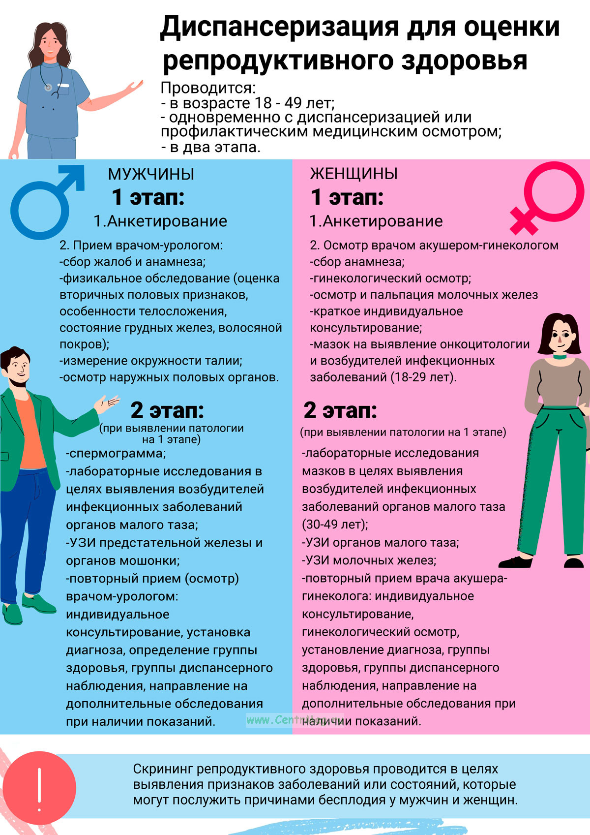Плакат информирует о важности диспансеризации для оценки репродуктивного здоровья, проводимой для мужчин и женщин в возрасте 18-49 лет. Описаны этапы обследования для каждого пола. Цель – выявление признаков заболеваний или состояний, которые могут привести к бесплодию. Плакат подчеркивает важность скрининга для сохранения репродуктивного здоровья.