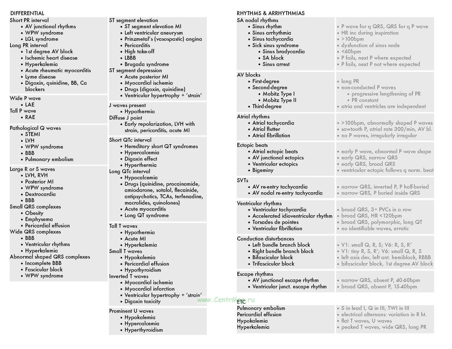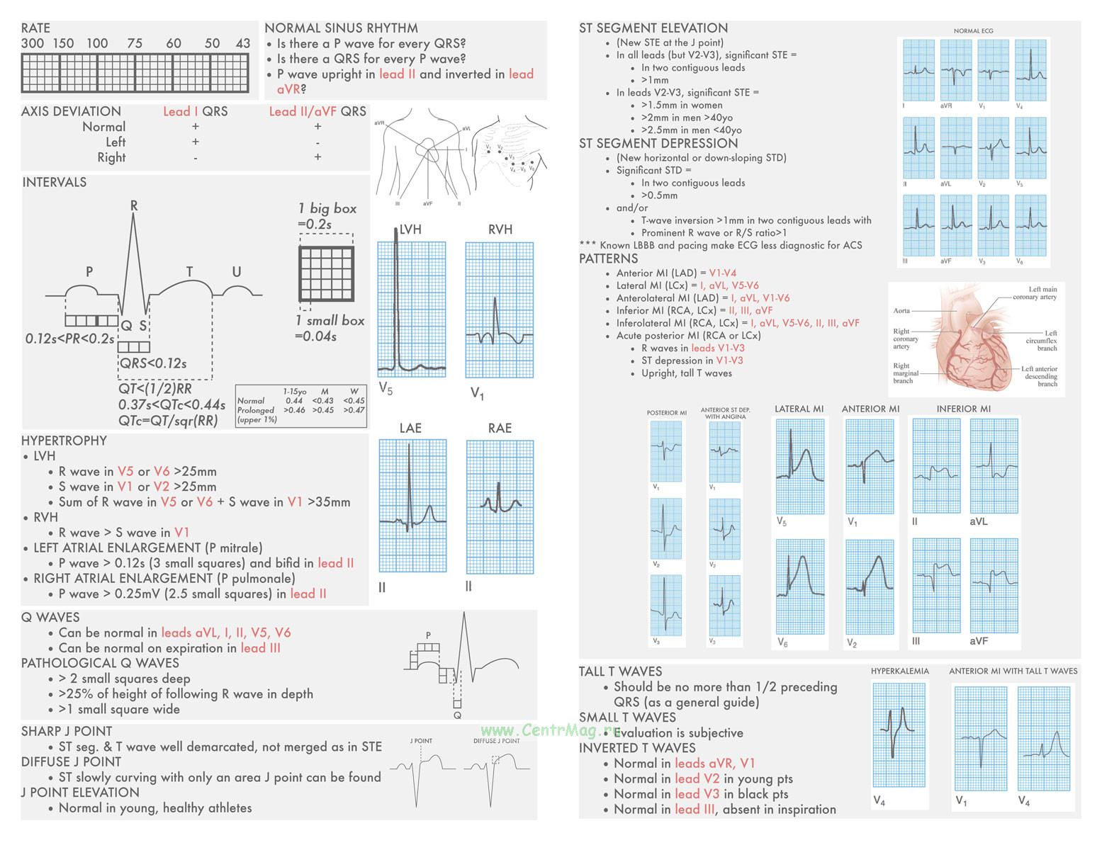 Плакат служит как наглядное руководство для врачей и медицинских работников для быстрой и точной интерпретации ЭКГ, диагностики патологий сердечного ритма, гипертрофий, инфарктов и других кардиологических состояний.