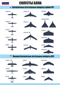 Плакат "Силуэты БПЛА наши и вражеские" служит наглядным пособием для распознавания различных типов беспилотных летательных аппаратов. В нем систематизированы и изображены силуэты основных видов беспилотников вооруженных сил РФ, а также похожие модели ВСУ, что позволяет быстро и точно идентифицировать объекты. Каждый силуэт сопровождается соответствующим названием для облегчения запоминания и сравнения.