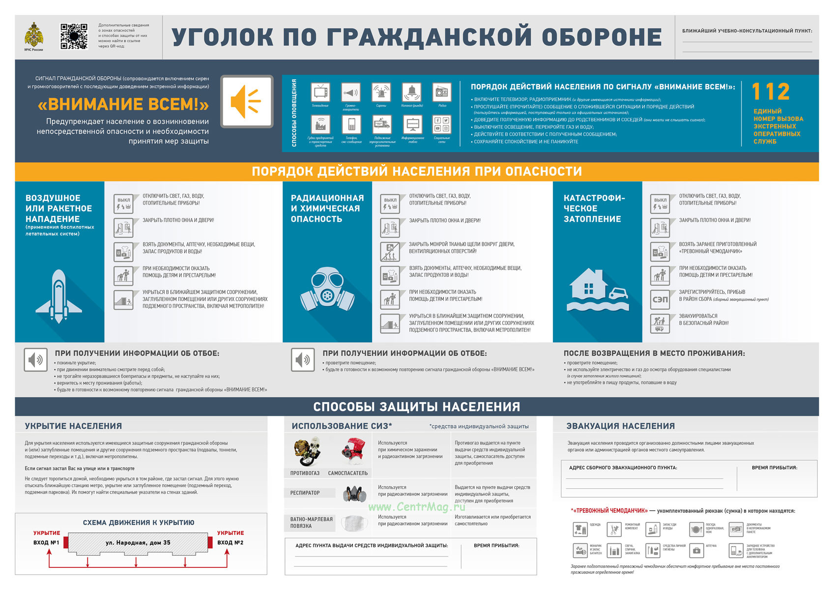 Плакат "Уголок по гражданской обороне" наглядно показывает порядок действий населения при угрозе или возникновении чрезвычайных ситуаций. В нём разъясняется сигнал оповещения "Внимание всем!", перечислены конкретные шаги при разных видах опасности и представлены основные способы защиты - укрытие, средства индивидуальной защиты и эвакуация. Основная задача - дать простые и понятные инструкции для сохранения жизни и здоровья.