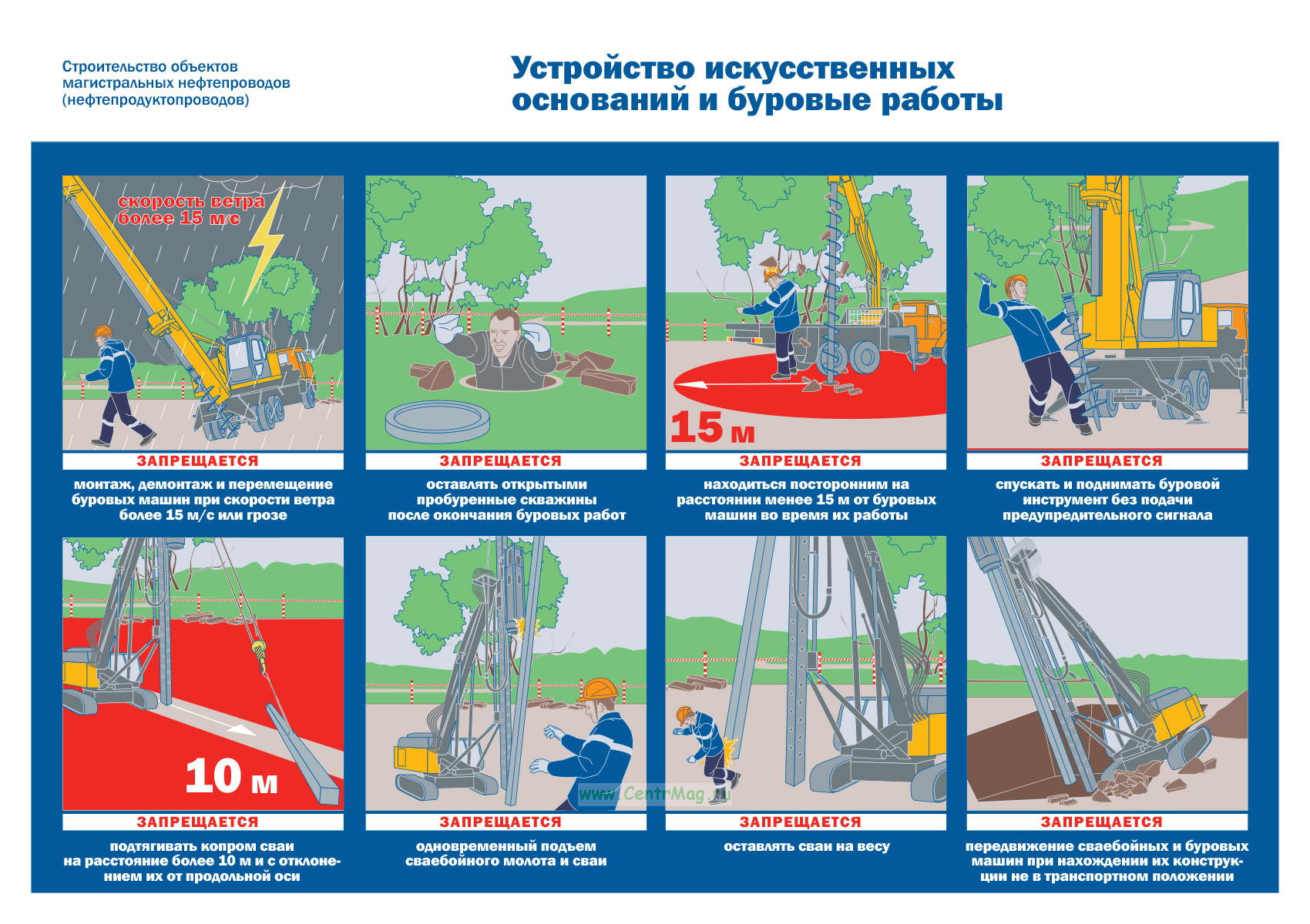 Плакат "Устройство искусственных оснований и буровые работы" - наглядное пособие по охране труда, предназначенное для информирования работников о правилах безопасности при проведении строительных и буровых работ. Он используется на строительных площадках, особенно при возведении магистральных нефтепроводов и других объектов, где выполняются буровые или свайные работы.