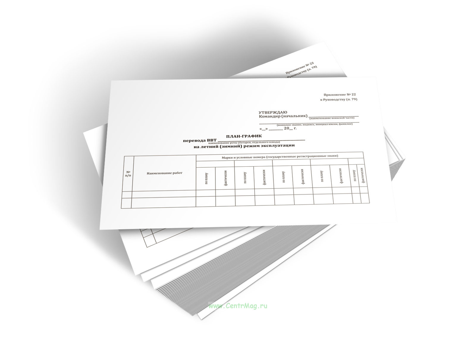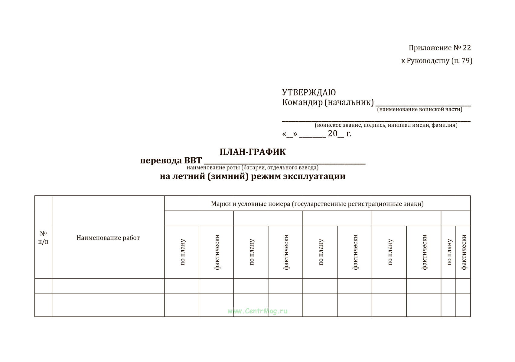 Форма План-графика перевода ВВТ на летний (зимний) режим эксплуатации соответствует Приложению № 22 Приказу Министра обороны РФ от 28.12.2013 N 969 "Об утверждении Руководства по содержанию вооружения и военной техники общевойскового назначения, военно-технического имущества в Вооруженных Силах Российской Федерации"