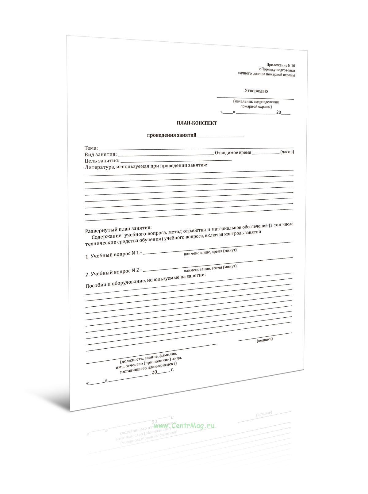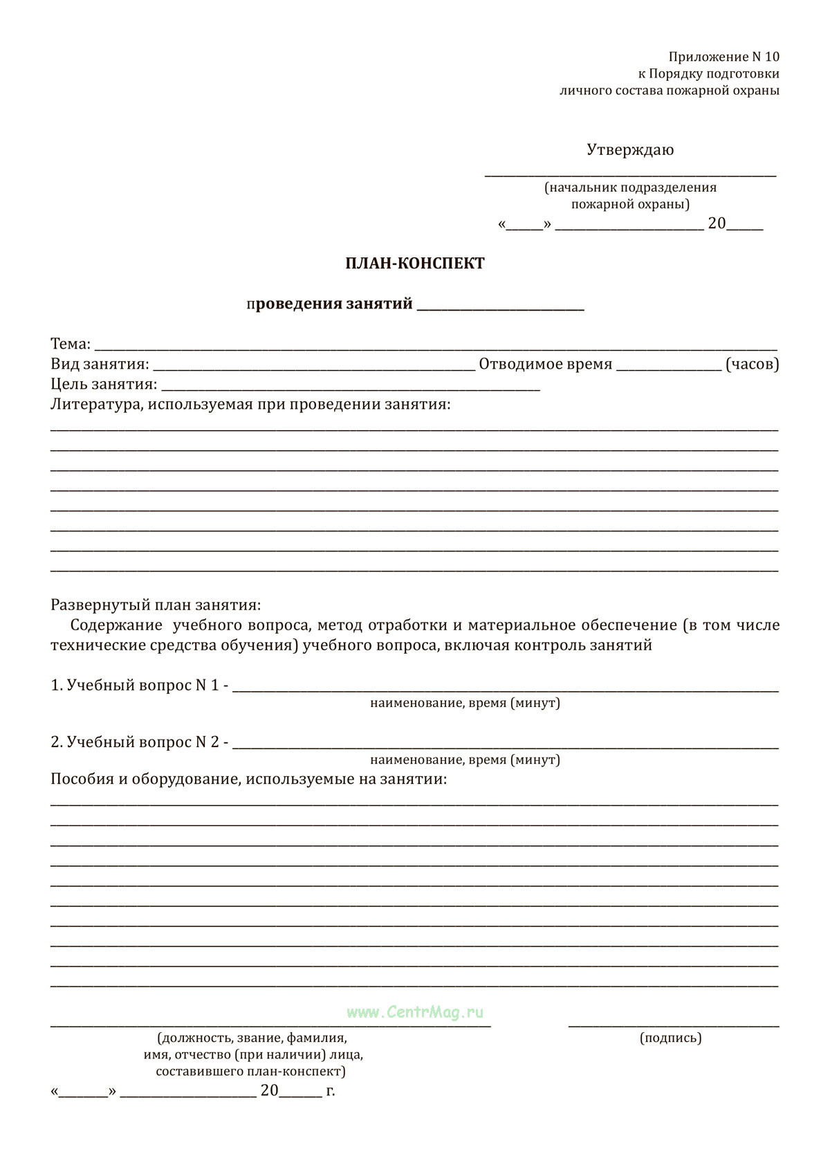 Форма Плана-конспекта проведения занятий соответствует Приложению N 10 к Приказу МЧС России от 05.02.2025 N 77 "Об утверждении Порядка подготовки личного состава пожарной охраны"