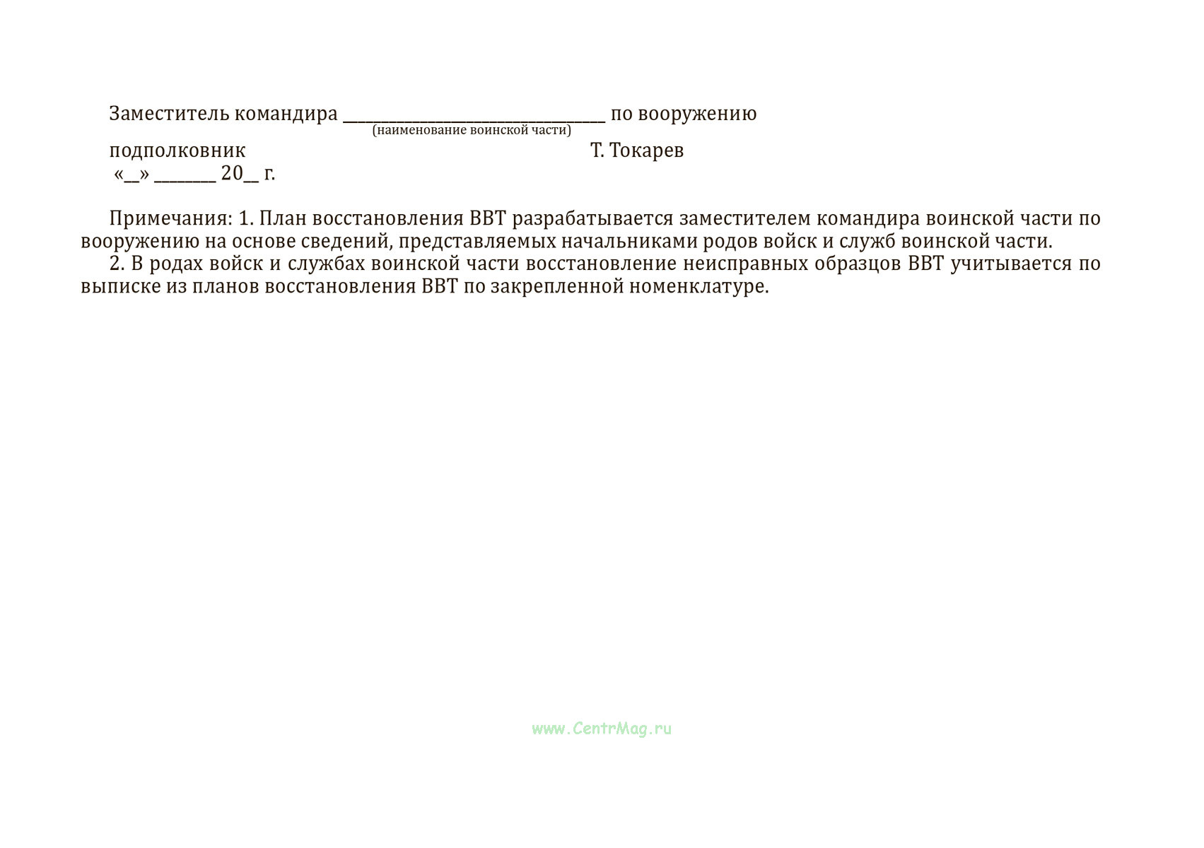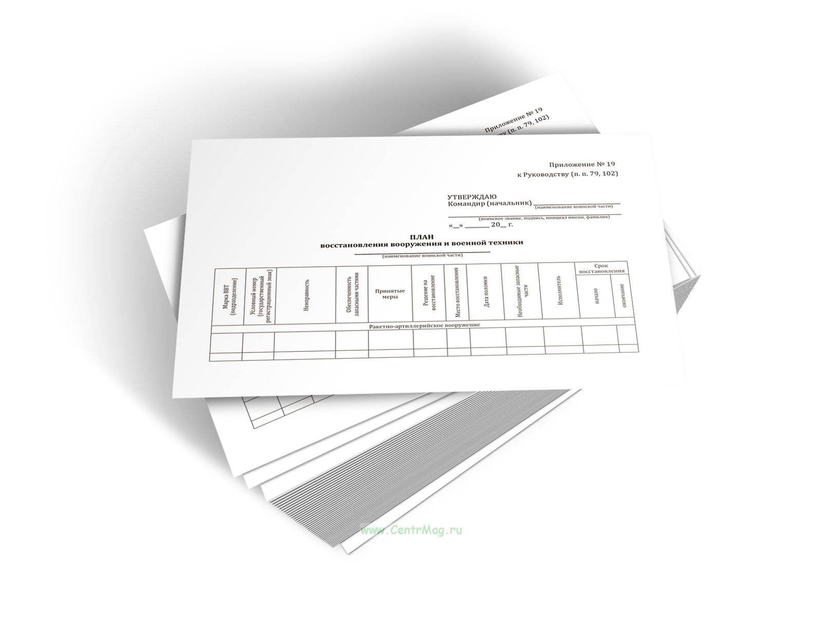 Форма Плана восстановления вооружения и военной техники соответствует Приложению № 19 Приказу Министра обороны РФ от 28.12.2013 N 969 "Об утверждении Руководства по содержанию вооружения и военной техники общевойскового назначения, военно-технического имущества в Вооруженных Силах Российской Федерации"