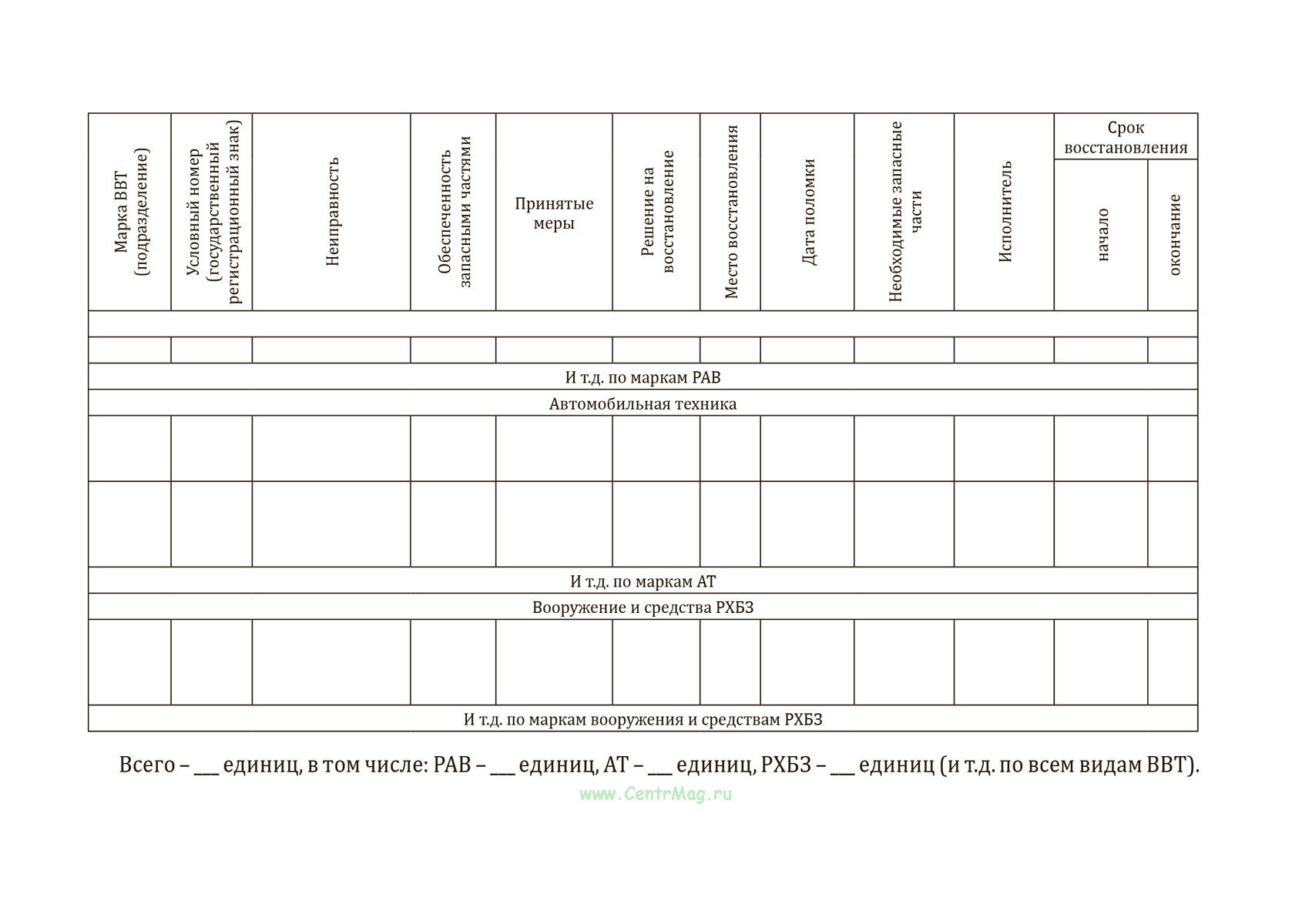 План восстановления вооружения и военной техники применяется для учёта, анализа и организации мероприятий по ремонту неисправных образцов ВВТ. Документ содержит информацию о марке техники, характере неисправности, наличии запасных частей, решениях о восстановлении, месте проведения работ, исполнителях и сроках. Он формируется на основе сведений, поступающих от родов войск и служб воинской части, и служит инструментом для координации восстановительных мероприятий и контроля исполнения задач по приведению техники в исправное состояние.