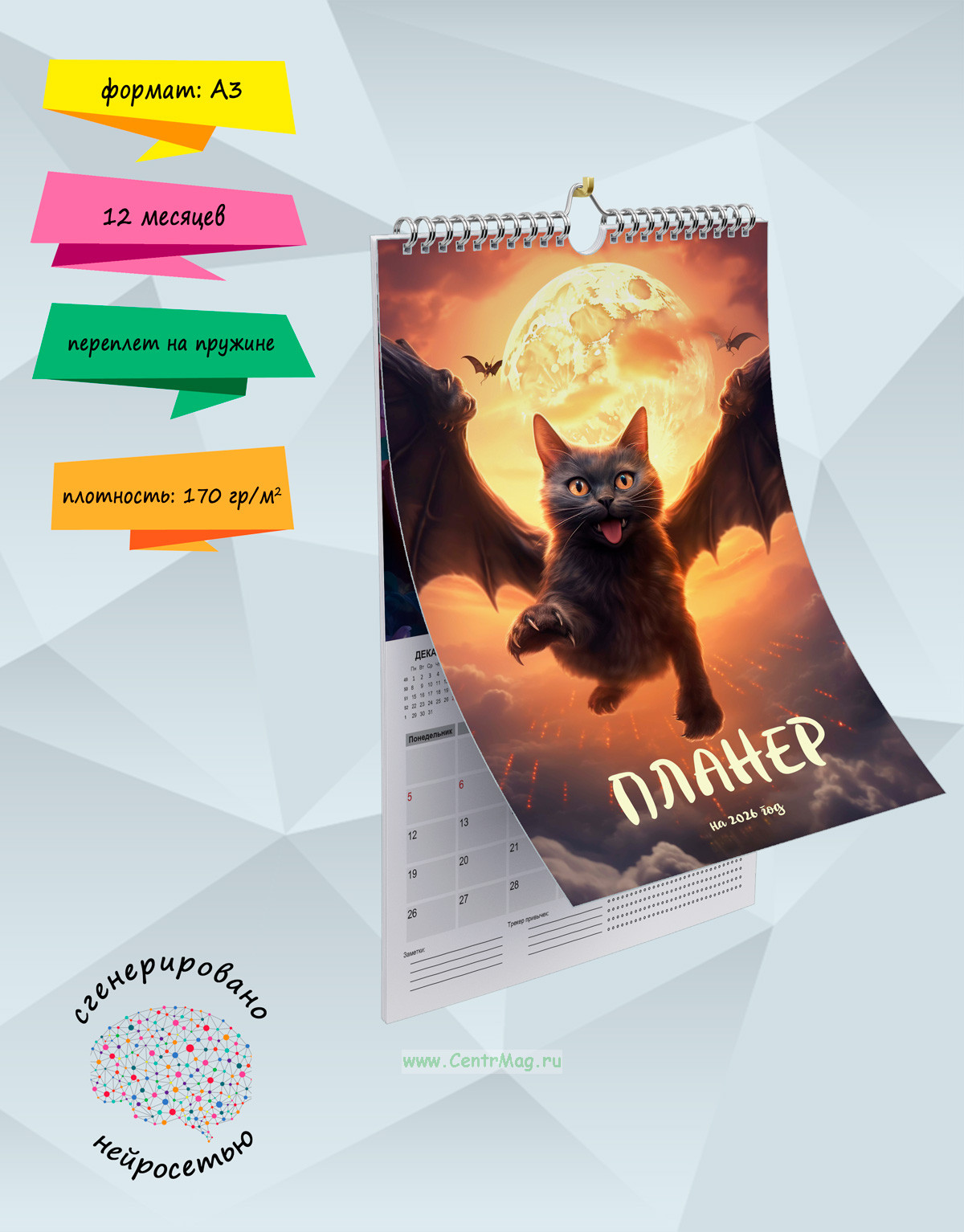Календарь-планер станет отличным помощником в делах, специальные поля в датах позволят записать важную информацию и не забыть ее. Изображения сгенерированы с помощью нейросети. Календарь будет отличным подарком для ваших родных, друзей, знакомых, коллег или даже для себя.