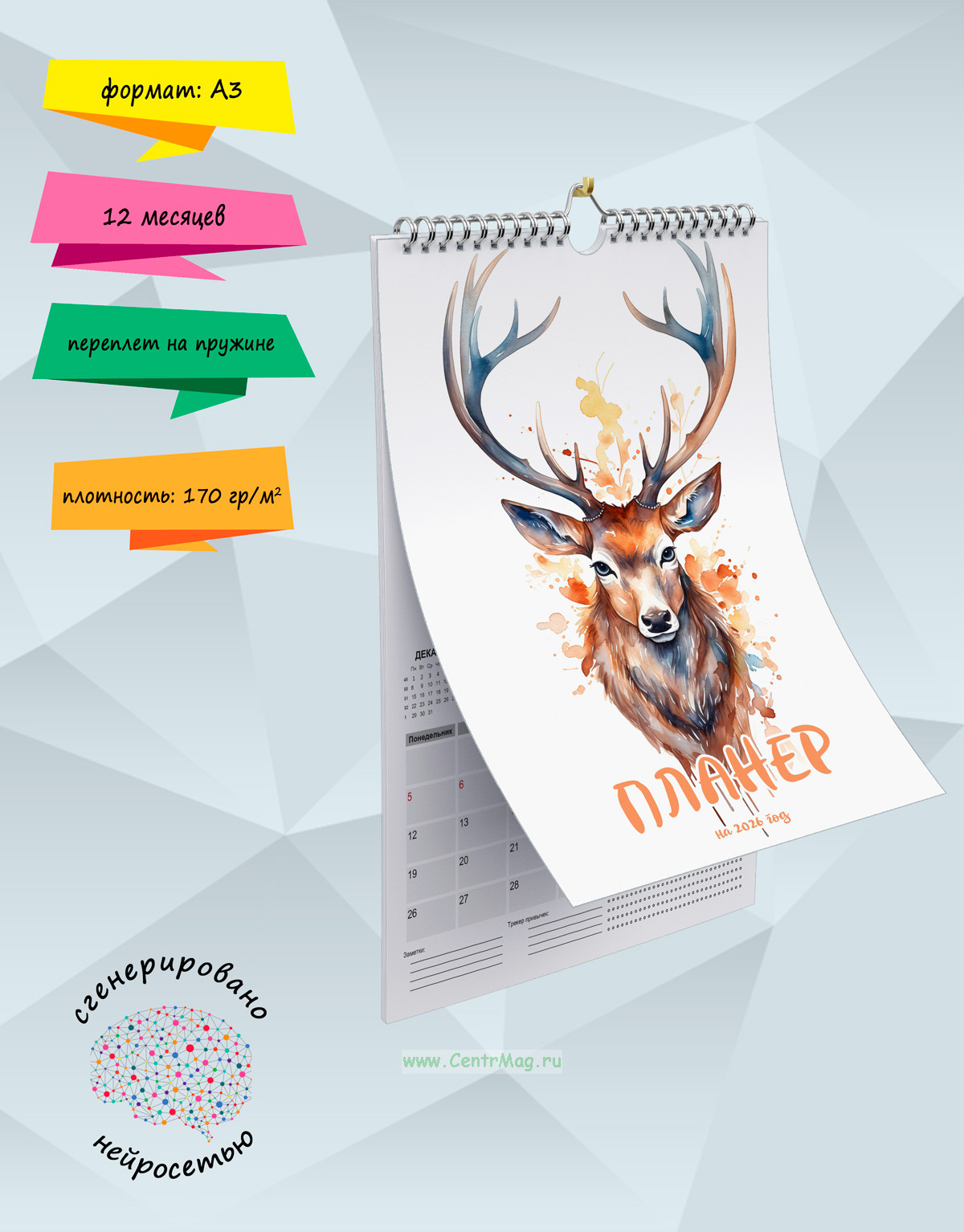 Календарь-планер станет отличным помощником в делах, специальные поля в датах позволят записать важную информацию и не забыть ее. Изображения сгенерированы с помощью нейросети. Календарь будет отличным подарком для ваших родных, друзей, знакомых, коллег или даже для себя.