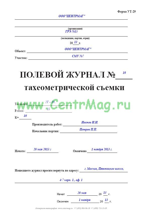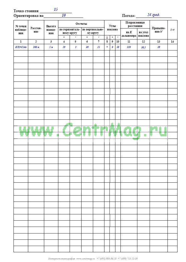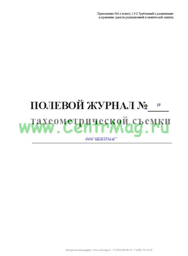 Форма полевого журнала тахеометрической съемки соответствует Приложению №8 к пункту 2.9.8 Требований к размещению и хранению средств радиационной и химической защиты. В результате выполнения тахеометрической съёмки плановые координаты и высоты точек местности получают одновременно, при использовании одного и того же прибора.