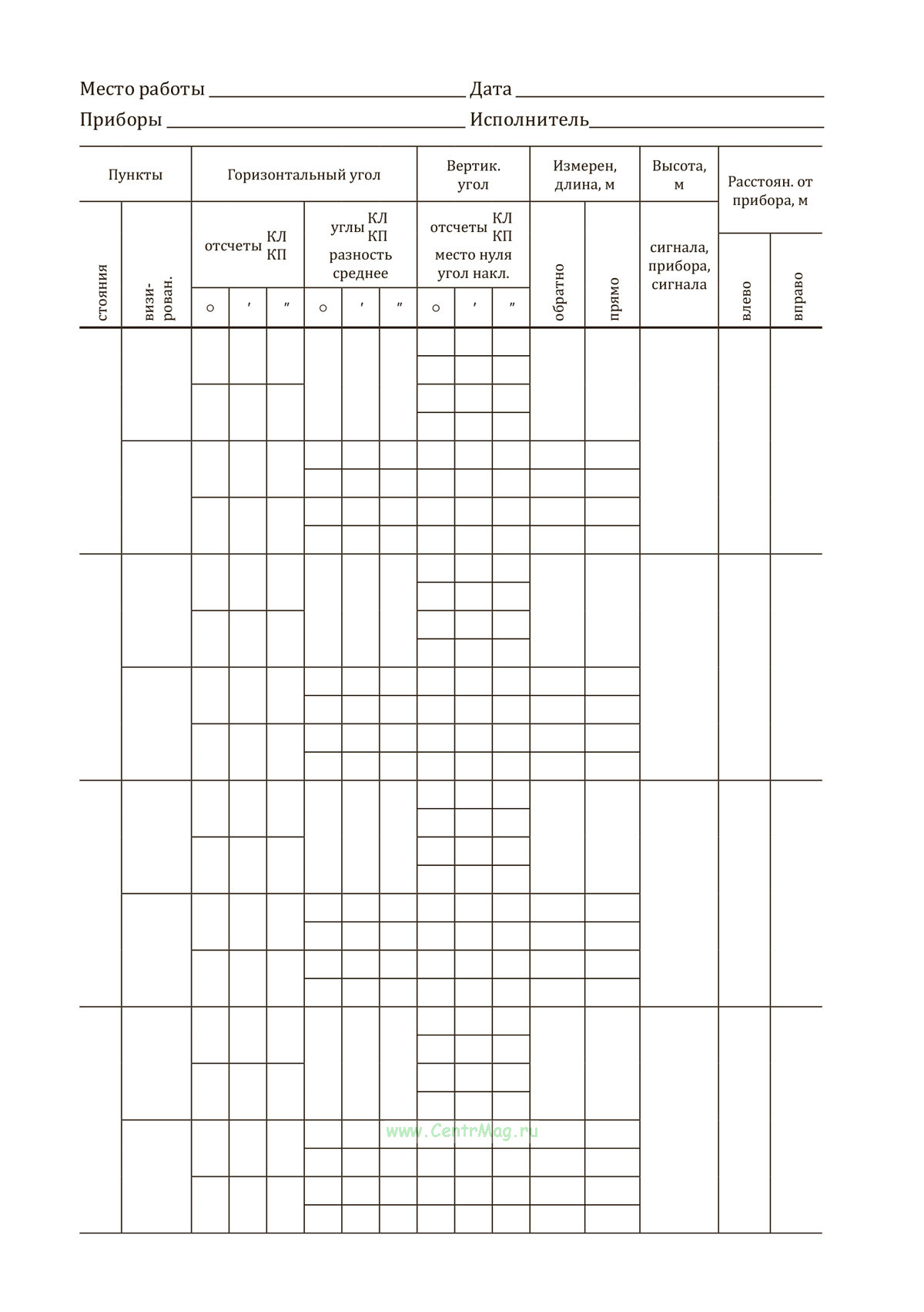 Журнал предназначен для детальной фиксации результатов геодезических измерений в полевых условиях, включая горизонтальные и вертикальные углы, расстояния и высоты, необходимых для построения и контроля геодезической сети.